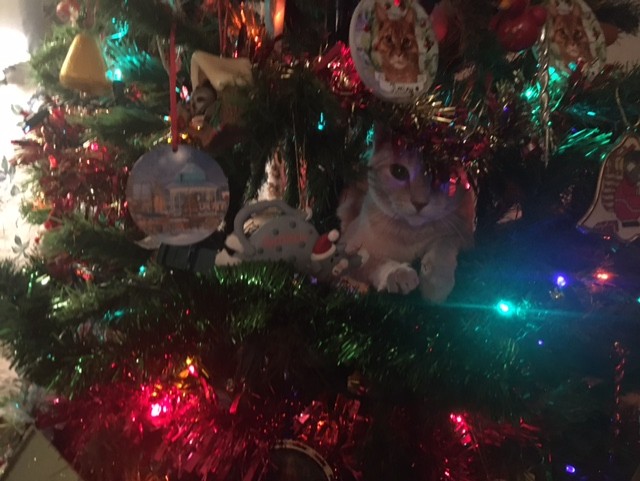 I got sis that cat ornament that looks like her two cats right above where the cat is sitting in the tree. It is so funny. It is like the cat is saying "This is my spot, right under the picture of me." Sis said right after that pic was taken her husband told her to get out of the tree, and she poked his finger and drew blood.