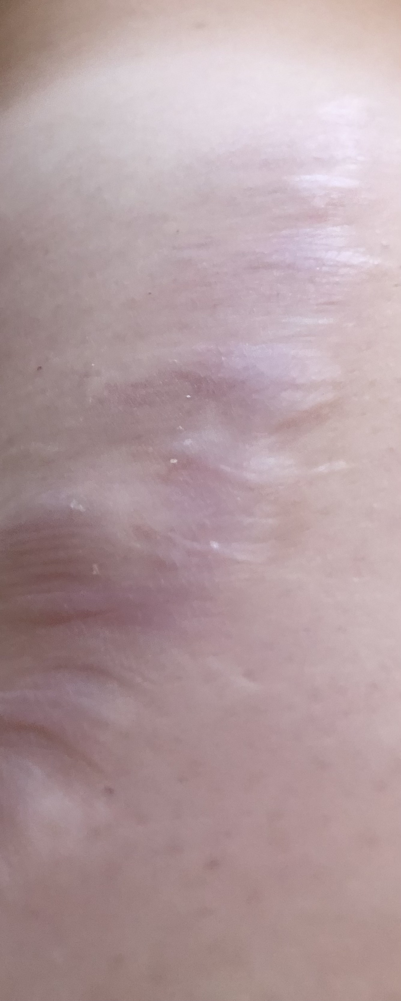So no one can explain to me how I got this 2nd degree burn when I was eighteen, and in the car wreck that damaged my neck and back. This picture doesn’t show all eight inches of it, but it’s long because the original burn was an awkwardly circular burn. When they did cosmetic surgery they cut out the burn, pulled the skin on both sides, and then sewed me up. What really hurt was months later them jamming a big old needle in my scar tissue to try to shrink the scar. THAT made me cry; not the original burn. Anyway, it’s not bright red anymore or hard, so it’s healed well (originally it wasn’t treated correctly, much to my annoyance -I guess bubbling skin didn’t alert the nurse enough to show the doctor).