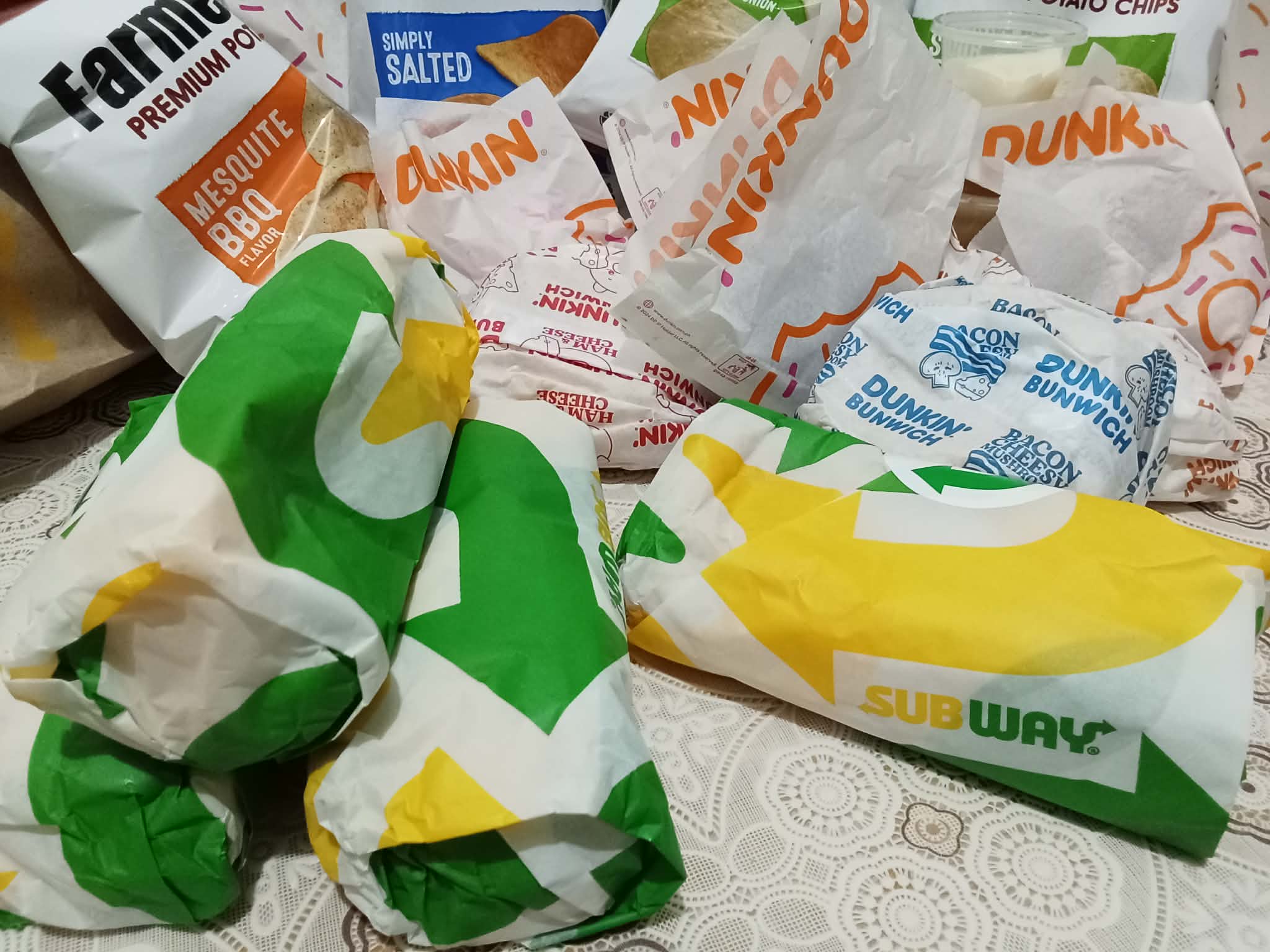 This is how God showers our family with little gifts; it is unexpected, but when my sister came home the other day, she had lots of sandwiches from Subway, Dunkin Donuts, and potato chips. Her company had an event, and after the event, all the remaining food was packed and given to the employees. Isn't it great?
