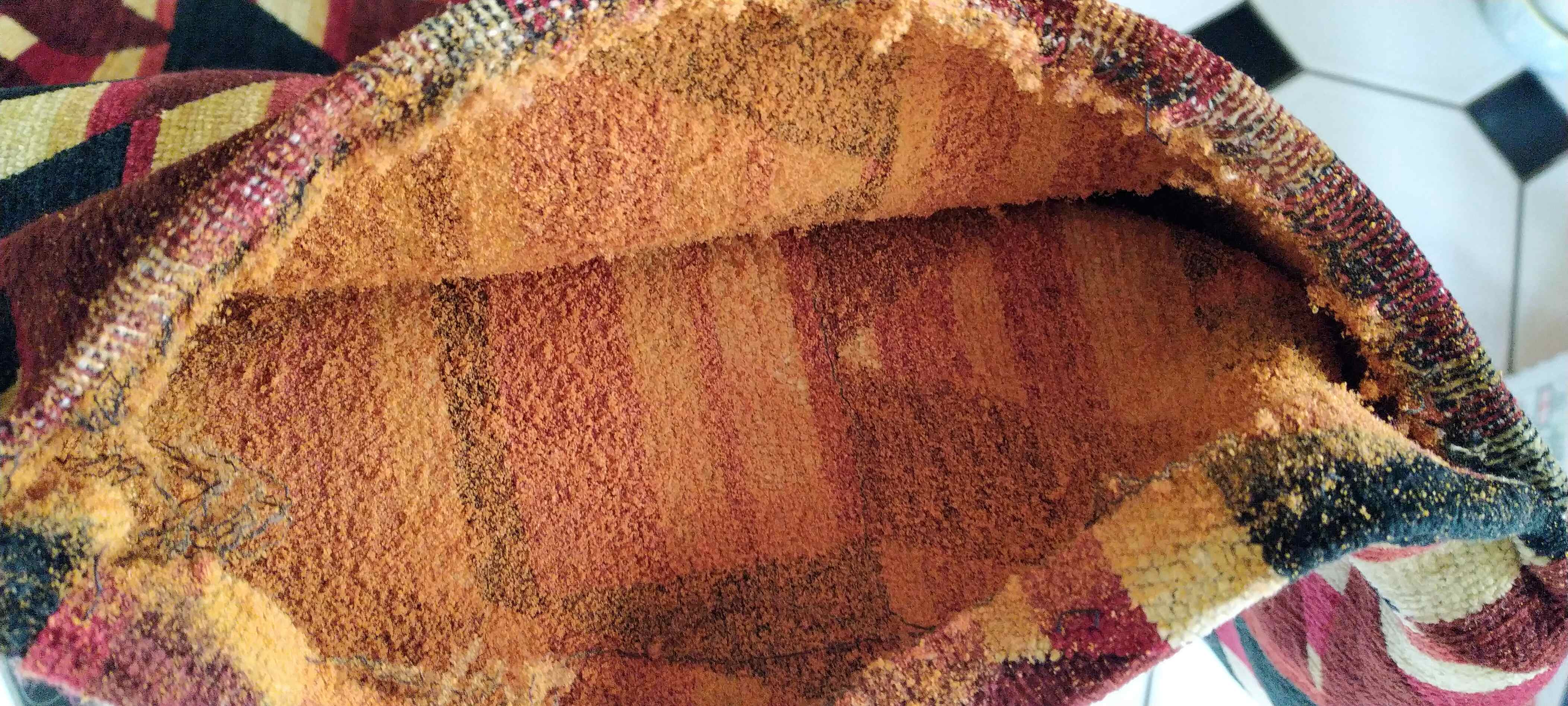 We are continually being told that plastic stays around forever, and that may be the case, but it isn’t true that it lasts forever in its original form! This kind of foam, which I think is polyurethane although I’m not sure, certainly doesn’t. I’ve had the same issue with a variety of things, from the lining of a cap (eugh that was horrible in my hair!!) to the padding inside a musical instrument case. When you buy these things you have no idea you will have to deal with the nasty consequences in a few years. And those tiny foam particles must get everywhere – I was afraid I might be breathing them in as I shook the contents of the cushion cover into the bin.