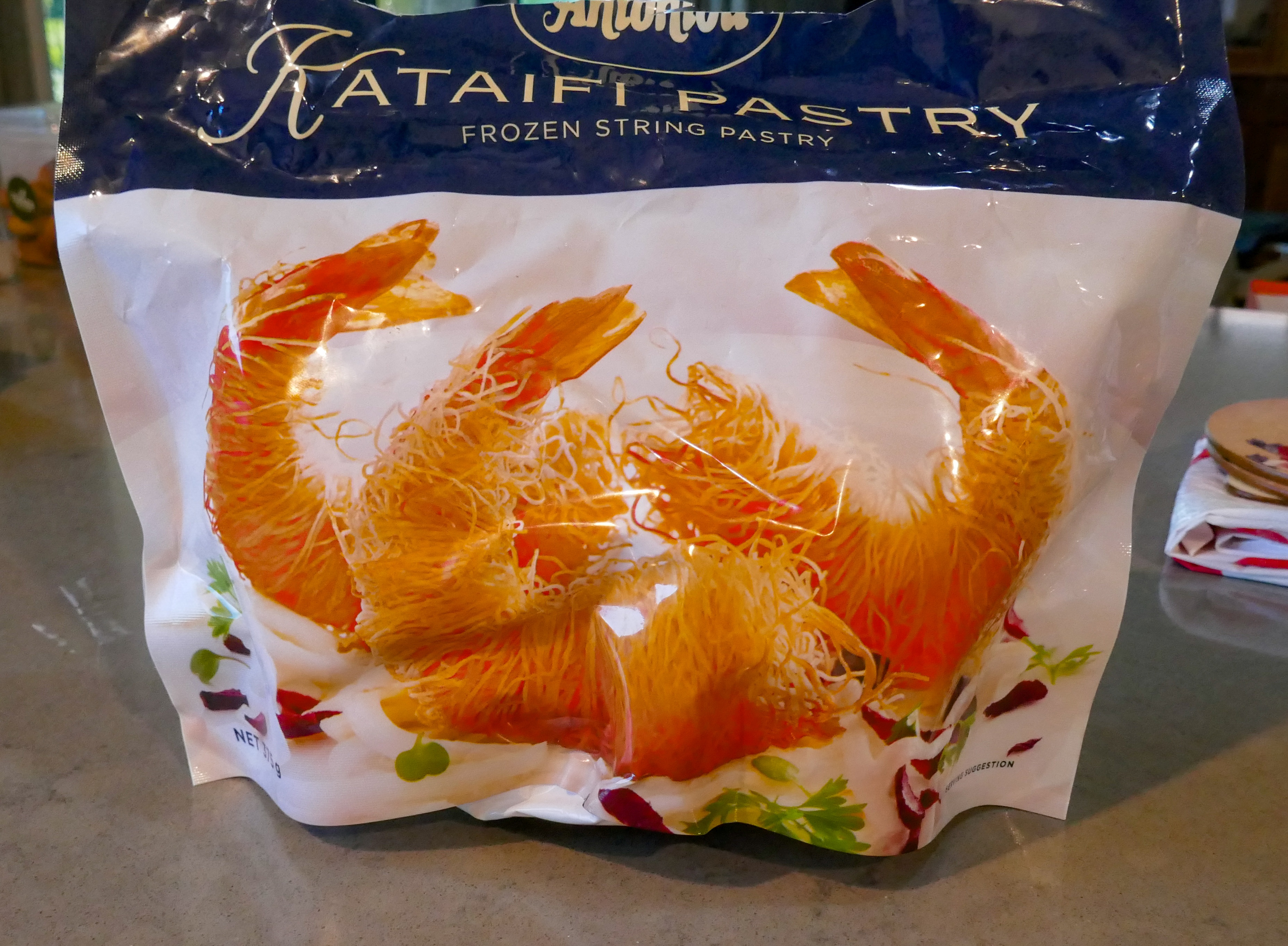 Kafaiti pastry comes frozen – well, ours did – so you have to let it thaw thoroughly. Then you have to tease the hair-like threads apart before wrapping the prawns in the pastry. You also have to squeeze out all the moisture before deep-frying them.