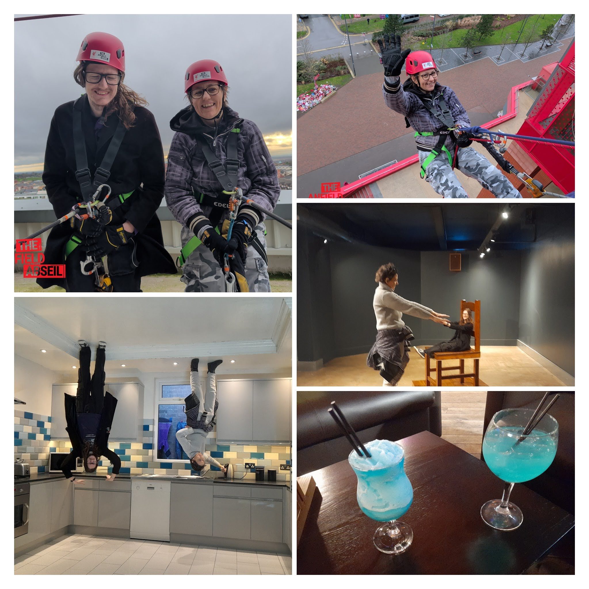 My son (Midi) and I have had a lot of fun over the past few days. We travelled by train up to Liverpool on Sunday. We checked in to The Liner Hotel before meeting up with Midi's friend for lunch. We then had a walk through Everton Park up to Anfield Stadium (which is home to Liverpool Football Club). We have no interest in football but we went for an abseil (as you can see on two images in the picture). I had abseiled once before but not for a long time. Midi had not done it before. He was quite nervous. He described the experience as 'fun but terrifying'