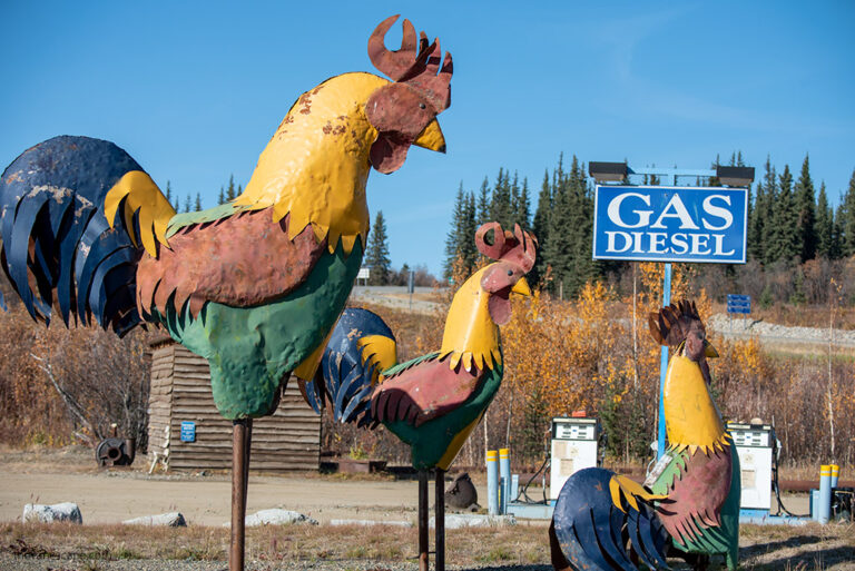 That is Chicken, Alaska 28 miles from the Alaska/Canada border, It is a former gold rush town. The name comes from the ptarmigan, a game bird from the area. The town has a population of 12. A significant part of Chicken, including structures dating back to the early 1900s and the notable F.E. Company Dredge No. 4 (also known as the Pedro Dredge), has been recognized for its historical value. This area is part of the Chicken Historic District, listed on the National Register of Historic Places. And guess what? If you have the money, you can buy chicken.