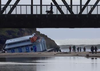 The Santa Cruz Munincpal Wharf is under repair currently. It was damaged by winter waves. Three workers working on a repair project were rescued.The end of the wharf containing the restroom was floating away in the water when the damage occured..The bathrooms became an unexpected tourist attraction.They were known as bathroom #3. The bathrooms floated away and people watched as they came ashore at the San Lorenzo River.People took pictures and even wrote on the walls.The new repairs are now giving shape. The damage had happened in 2024 during a large storm. The famous Dolphin restaurant was also damaged and had to be demolished. Pictured is bathroom #3, which floated away and had actually been seen floating in the ocean.