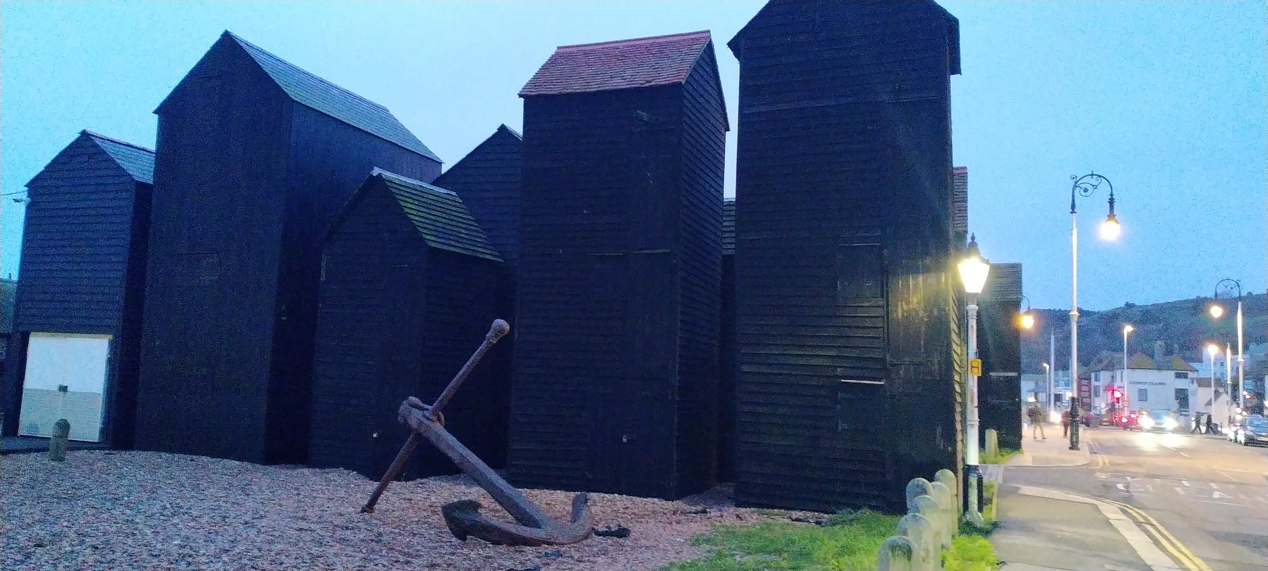Another notable feature of Hastings is these characteristic multi-storey sheds, known as net shops, a unique feature of the Old Hastings seashore. Storage sheds were necessary when nets were made of natural fibres and needed to be stored dry when not in use, to prevent them rotting away. But until the late 19th century, when a groyne was built which caused the shingle beach to expand, Old Hastings had very little space on shore between the sea and the cliffs, so of necessity the sheds had to be built upwards.