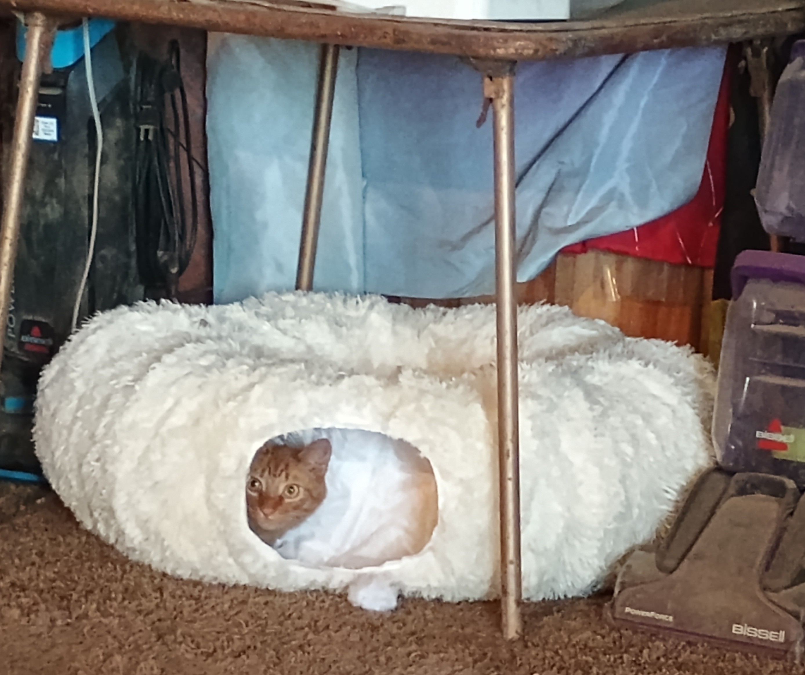I got my Amazon delivery this morning. So I got the tunnel bed put together. Fuzzy was in it while I was doing that. But I finally got it together and where I wanted it.