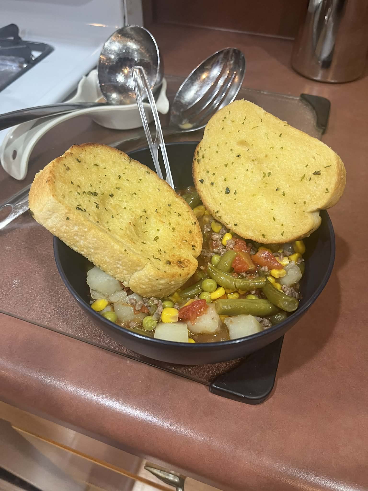 I browned and seasoned some ground beef, then added it to chicken broth, cooked soft potatoes, peas, green beans, corn, tomatoes and made soup.