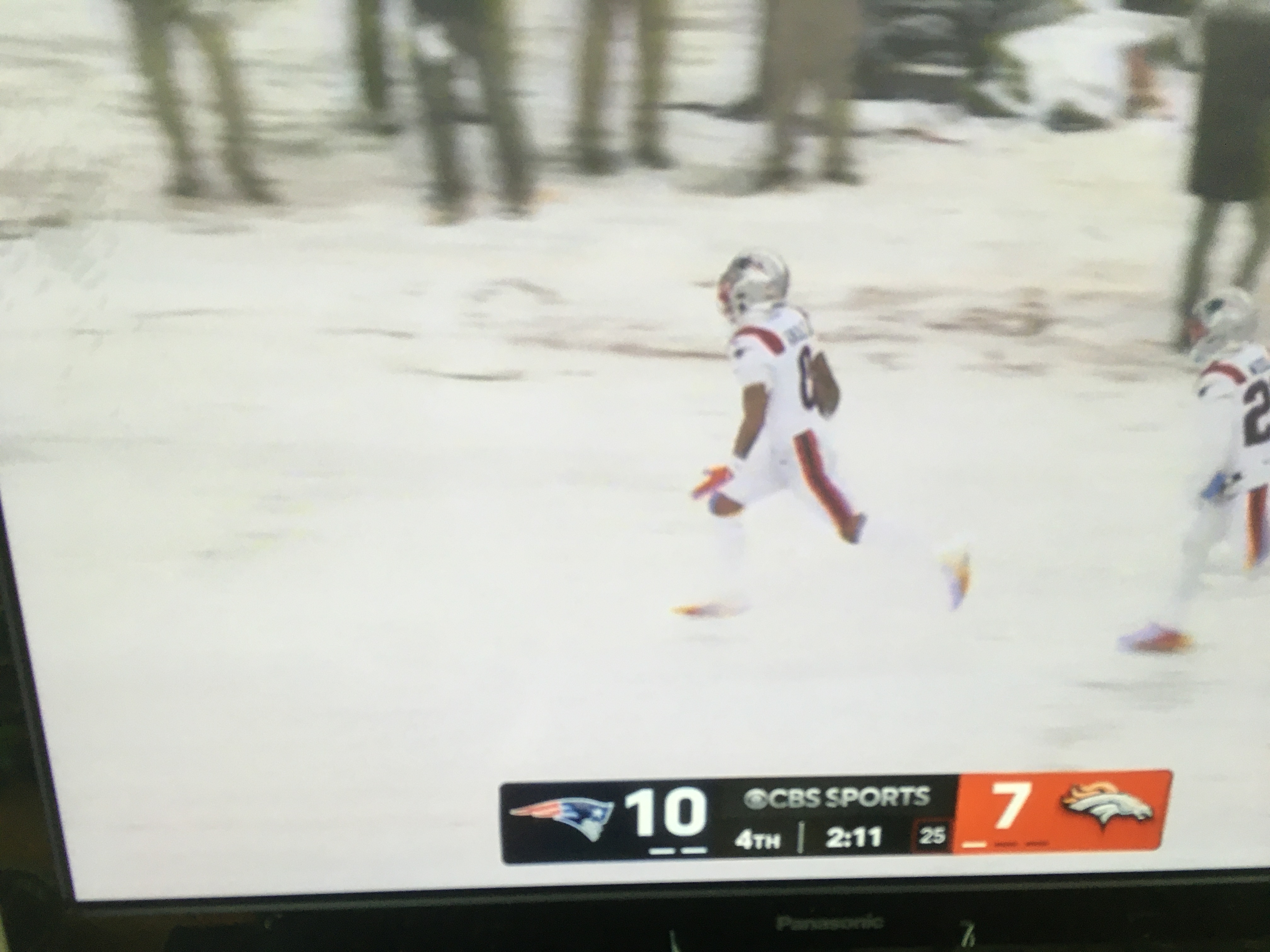 The Denver Broncos and New England patriots are playing in Denver. You can see the snow falling right in front of everyone on screen. The temperature plummeted considerably during the course of the game. Everyone seems to be comfortably dressed, though. The grass is mostly white with snow now.Everyone's hats are topped with snow! The Broncos really stand out because of their red uniforms. It sure is a good thing they are not playing in New England!