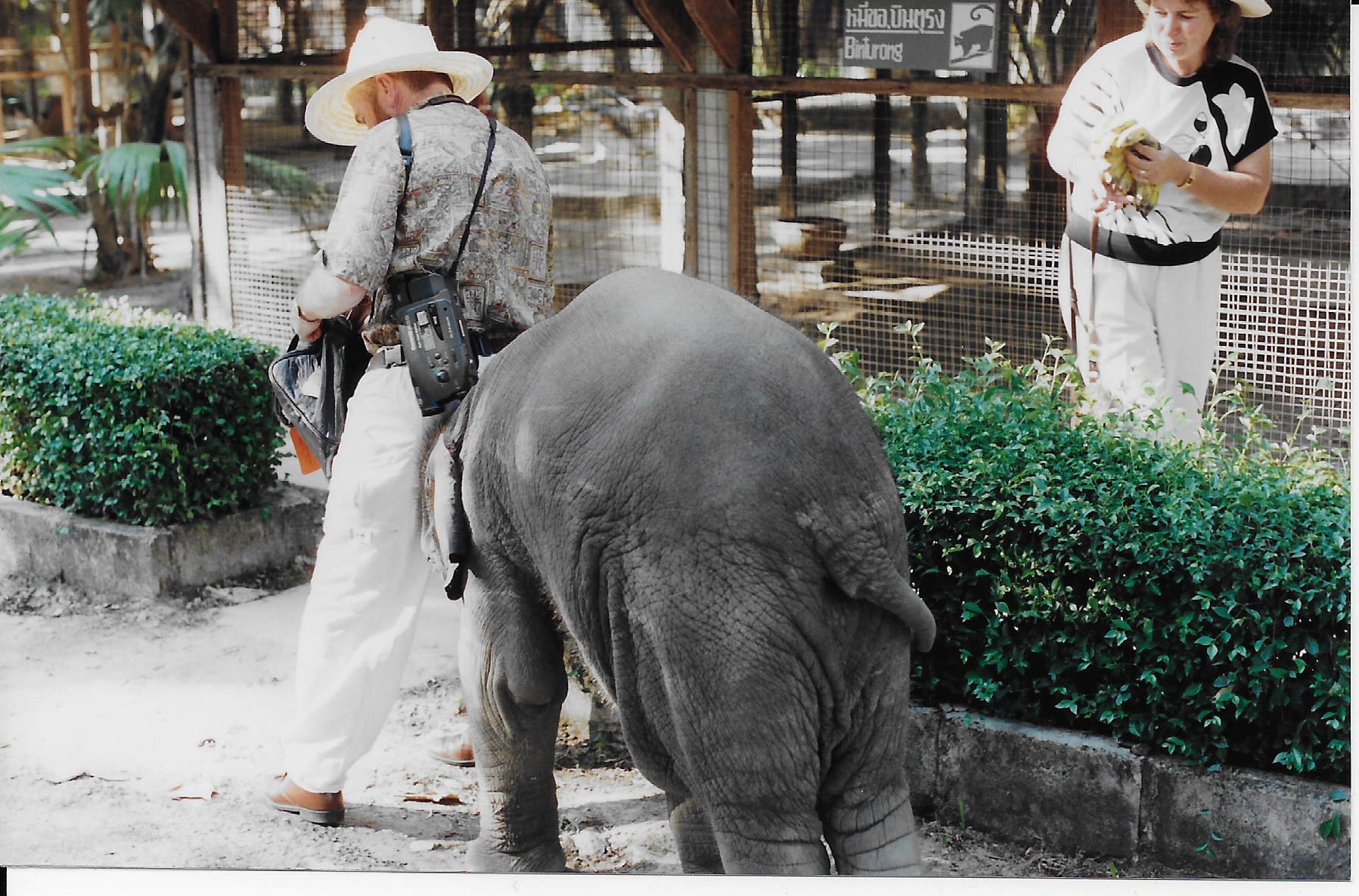The photo is another one from Thailand. Viince is trying to change the film in his camera and the baby elephant was throwing his weight around!