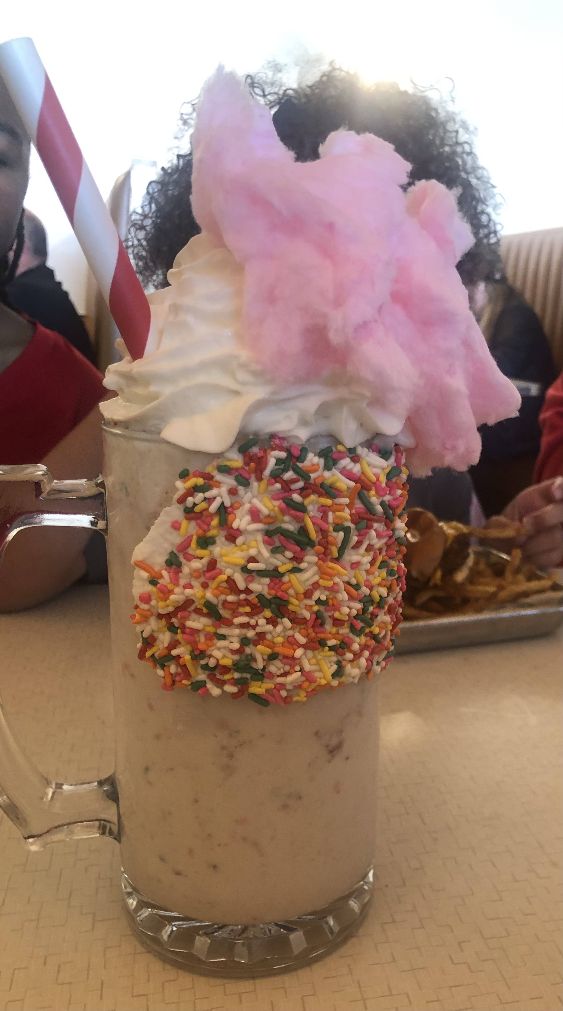 This is a small strawberry shake (with sprinkles, fruity pebbles, and cotton candy) my sister got for free at Mad Eats, where we ate for her birthday lunch today. You should see the large ones! She split it five ways, between her, the kids, and my dad (she really wanted him to try it). I didn’t think I could stand that much sugar. It sure looked good though!