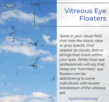 The other is an eye floater, or floaters. A tiny black speck, or group of specks, that can come and go and they seem to actually float through the air--a person sees them, of course no one else does, and you literally want to reach up and grab them. I've had them now and then, but very minor, and then they have never lasted very long--presto, they leave very quickly. Floaters rarely, if ever, affect people's vision unless it's a huge one that will not move out of your line of vision.Floaters are common in adults from their 40's on up.