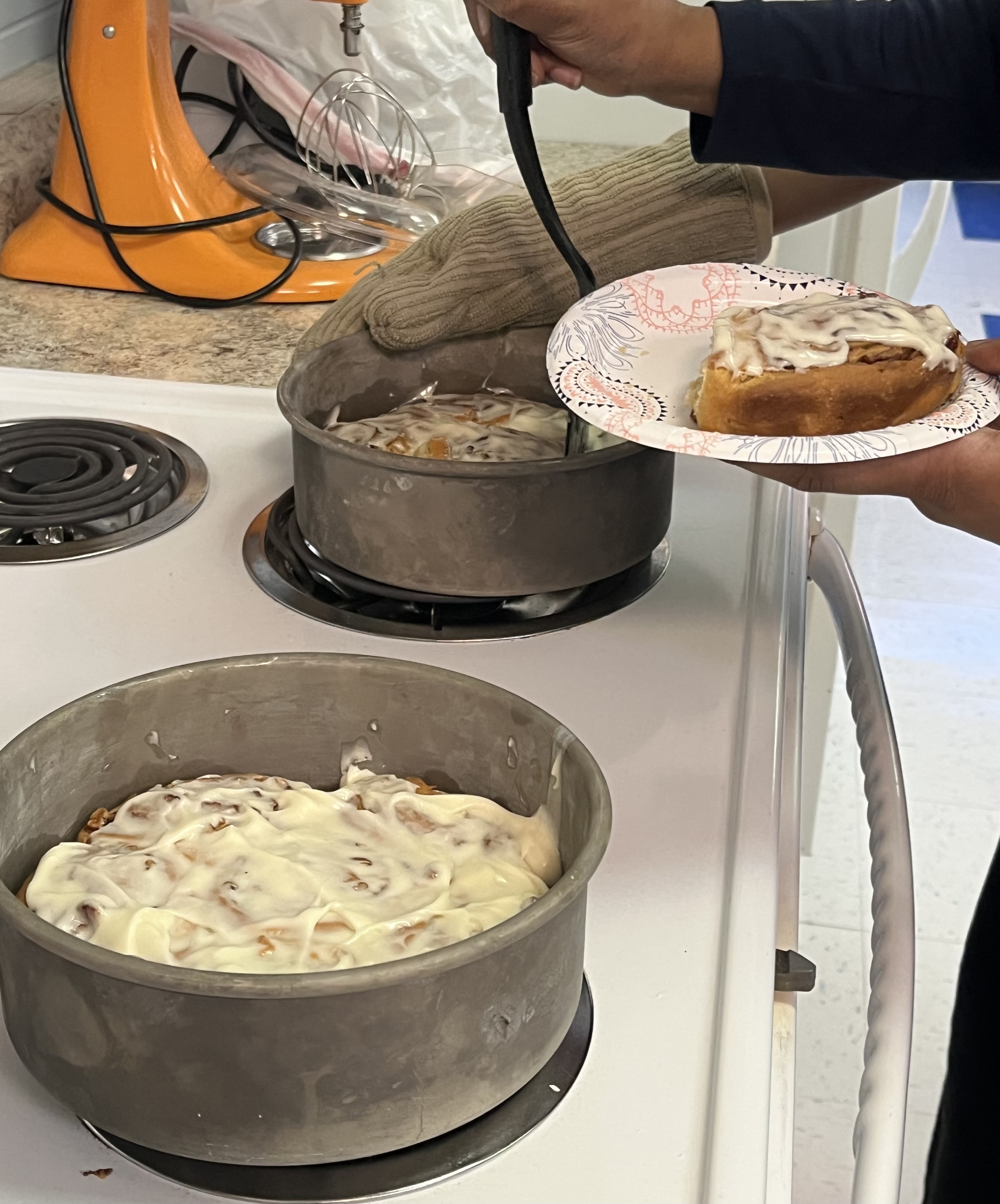 There were over 20 students waiting for me when I got down there after school. The cinnamon rolls were baked but not yet browned. I increased the temperature and told the kids that they'd have to wait about 10 minutes. A couple of them couldn't but the majority stayed. When they were ready a couple of the students spread the frosting on them and then everyone served themselves.