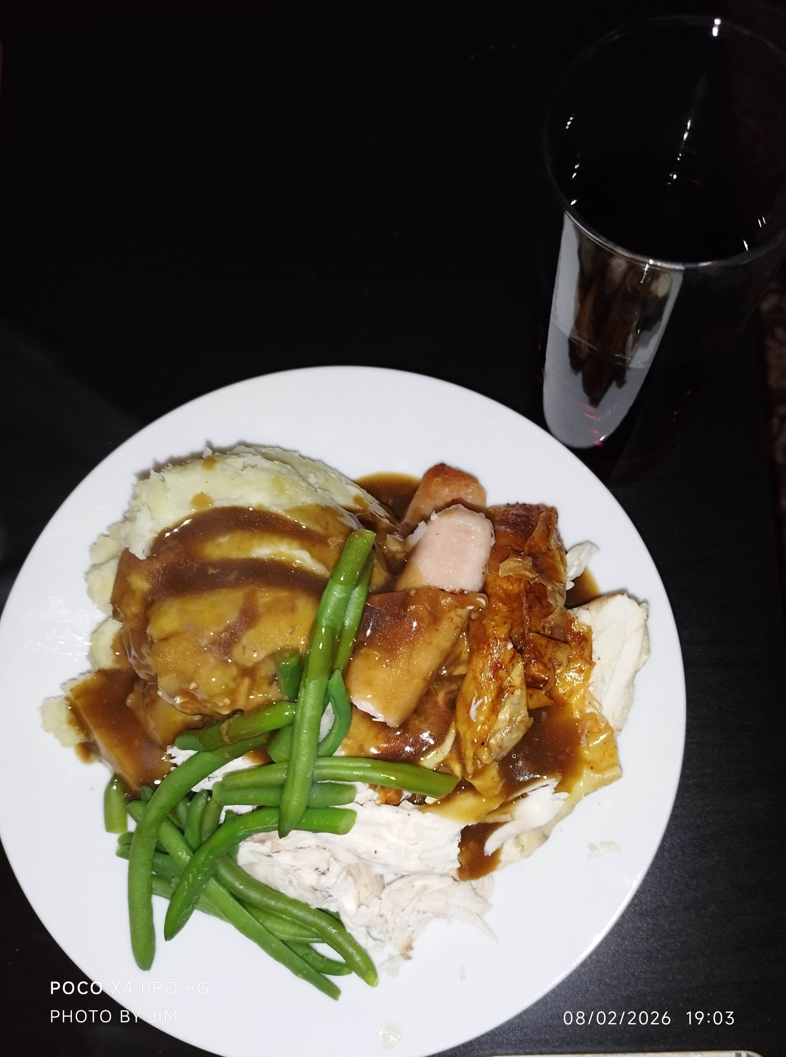 Roast Chicken, Pork Sausages, Green Beans, Mashed Potatoes and Gravy to die for.