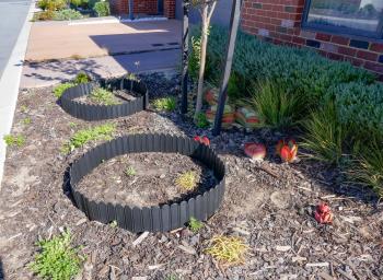 I cropped the photo. It's not a pot but an edging affair. You can see them here before the shrubs were planted.