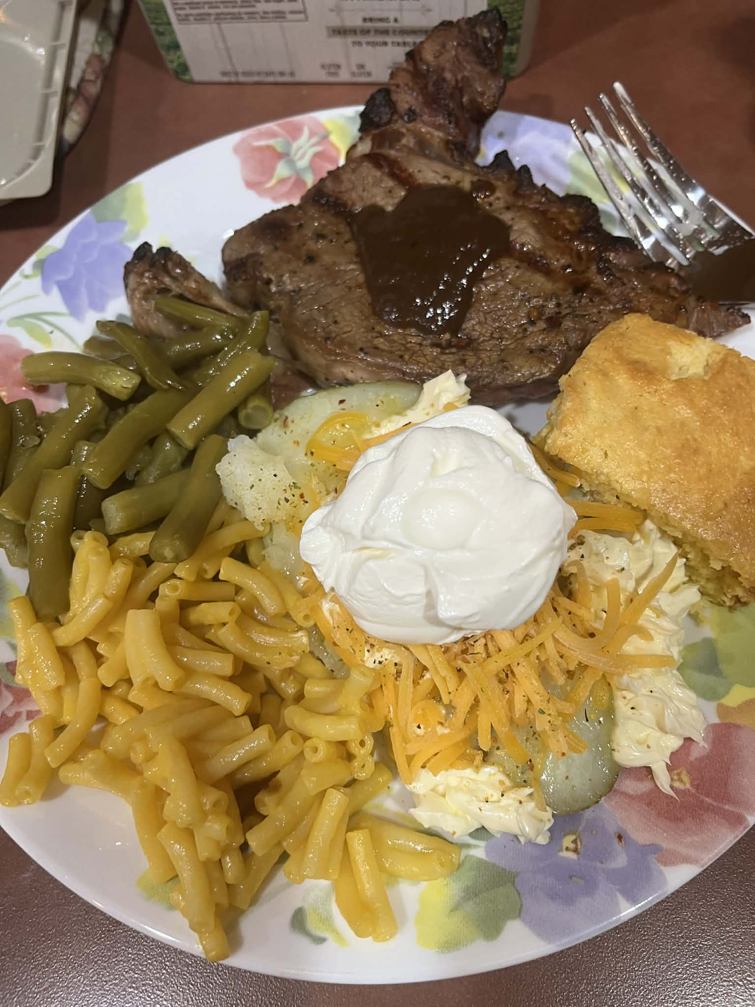 We had ribeyes, baked potatoes, homemade cornbread, green beans and mac and cheese. It was really really good. My eyes were bigger than my stomach again because there's still half a steak on my plate.