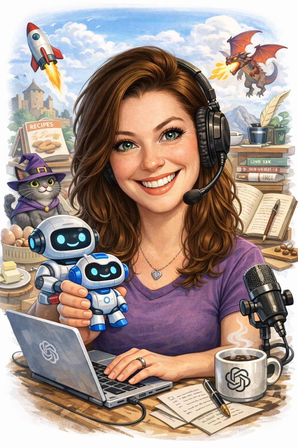 Most of you know my “real job” is freelance writing, so that part made sense. It absolutely leaned into that. Apparently I give off strong “typing furiously while juggling deadlines” energy. I also do a few random freelance gigs here and there, which I’m assuming explains the headset. Nothing says “multitasking queen” like looking one minor inconvenience away from launching a podcast.