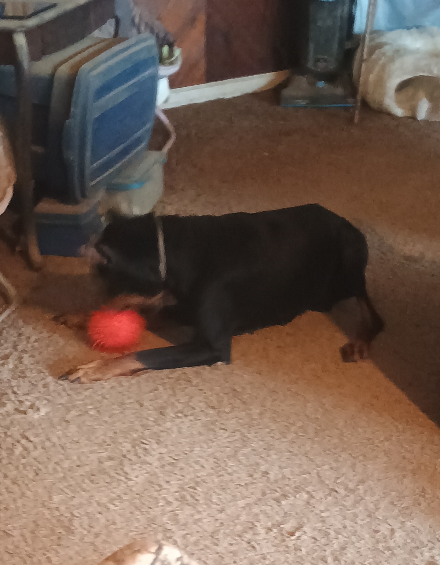 I think Duke doberman was trying to cheer us up this morning. He did and I think cheered himself up too. I know he also made Patch border collie happy. She managed to get the ball and then was playing keep away with him. She was not interested in that ball since I got it at Christmas until she seen Duke playing with it.