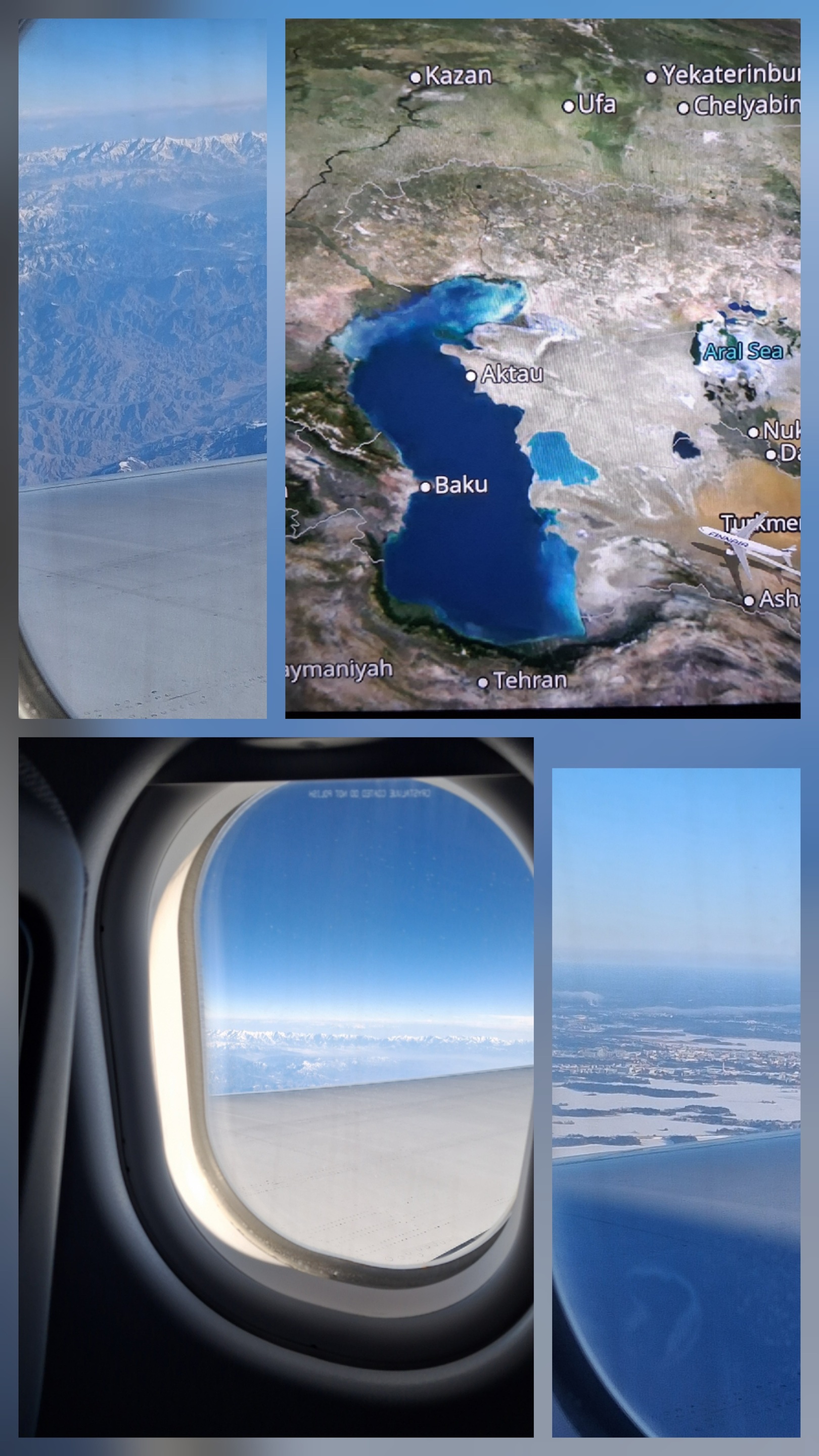 Right Top : A view captured showing our flight route over Turkmenistan, approaching Caspian Sea(Lots of Geography here!).