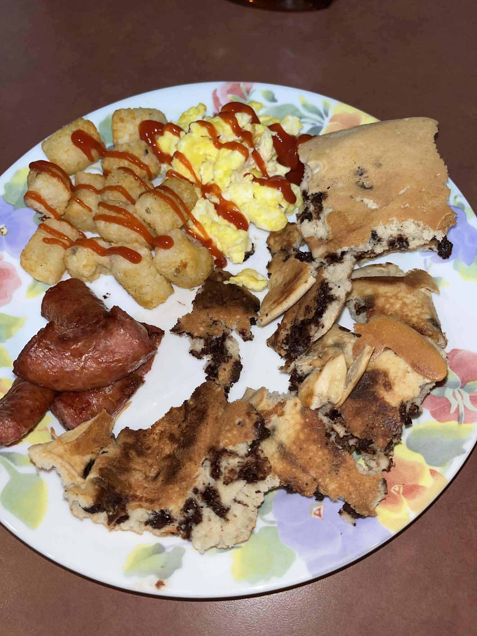I made homemade chocolate chip pancakes, threw some Conecuh sausage in the air fryer (if you've never had Conecuh, you need to change that), put some tater tots in the other air fryer, and then made some scrambled eggs.