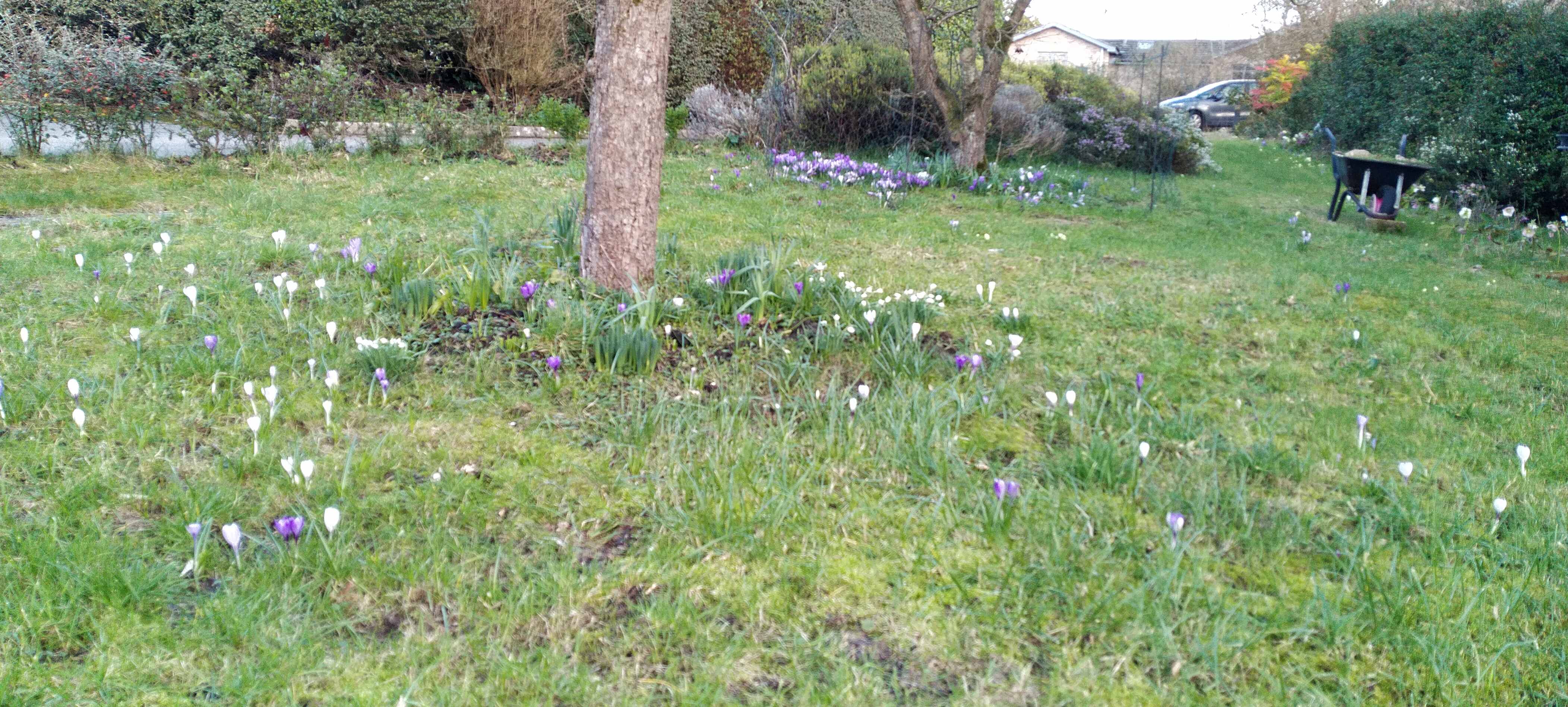 In the picture you can (hopefully) see the pool of purple and white crocuses around the base of the plum tree in the background. Our predecessors planted a ring of spring bulbs around every tree. But then you can see they are slowly spreading all around the place. Hellebores (a few are just visible under the bush on the right) are also colonising the shady patch right outside the window.