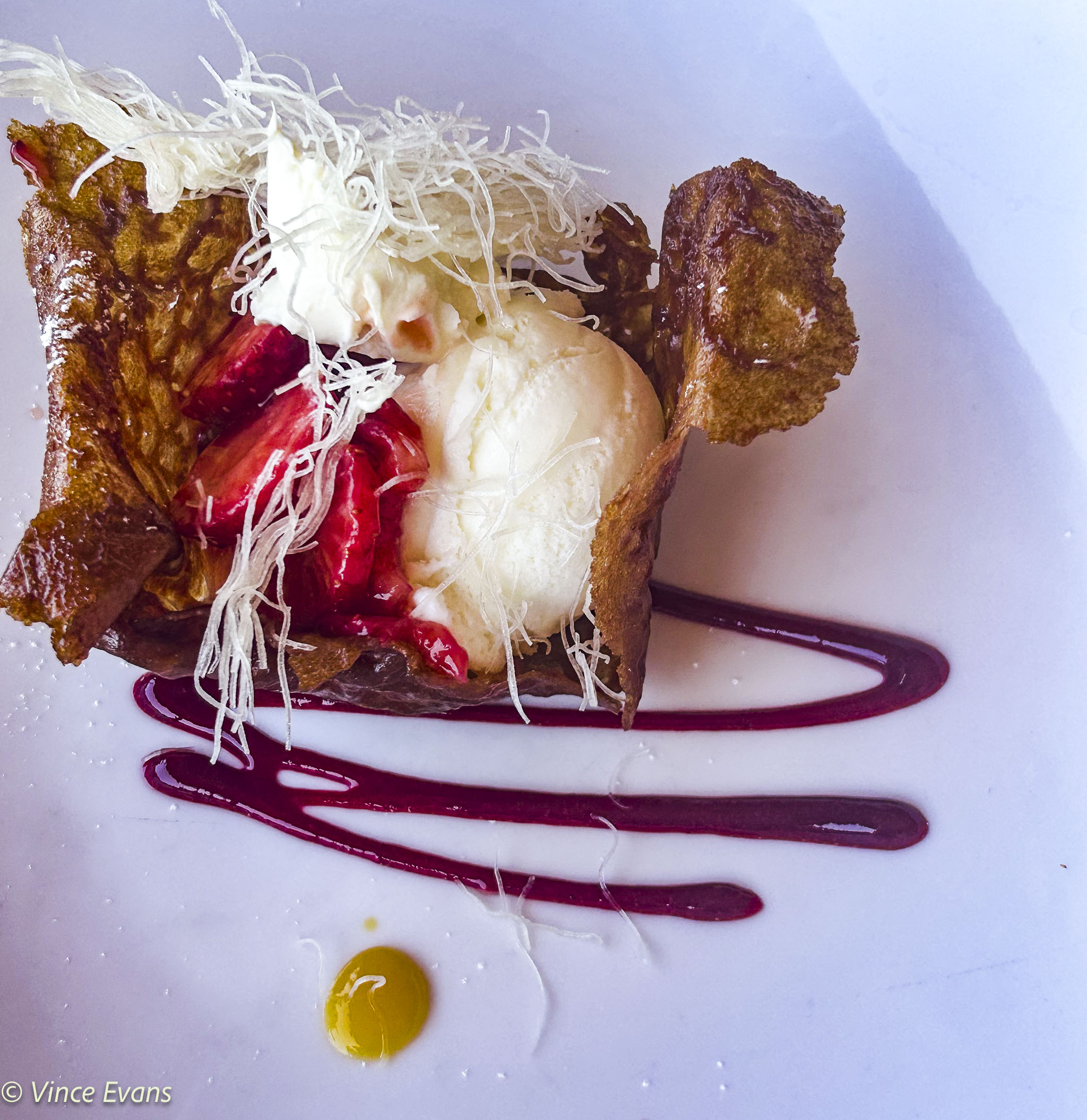 Feast your eyes on Vince’s photo. The ‘basket’ is made of the same stuff as brandy snaps. It holds ice-cream and strawberries sitting in some yummy syrup. Then, just to top it off, there was angel hair (spun sugar) on top.