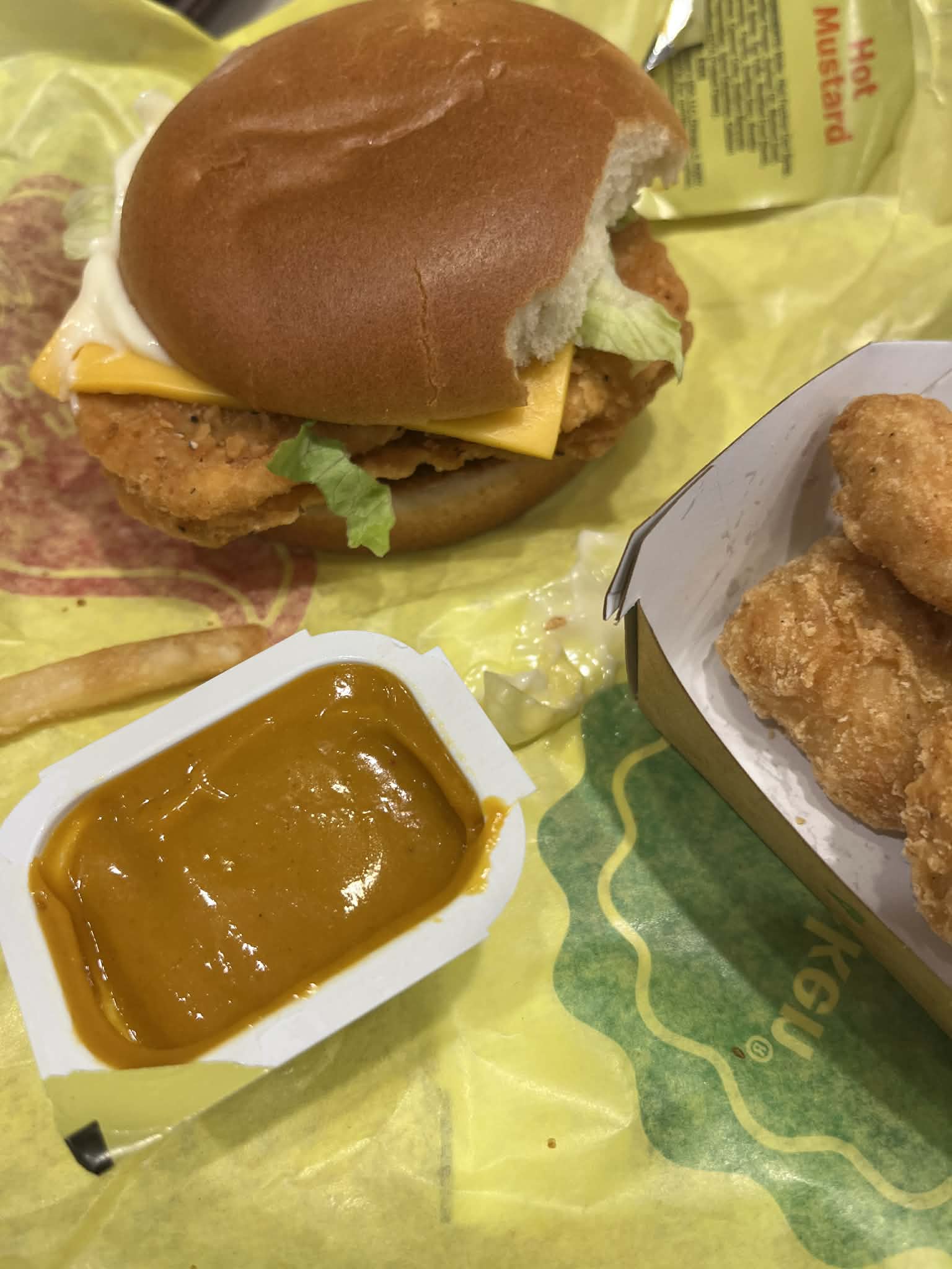 I got a crispy chicken or McChicken, fries, nuggets with spicy mustard ( I ordered honey mustard) and a coke.