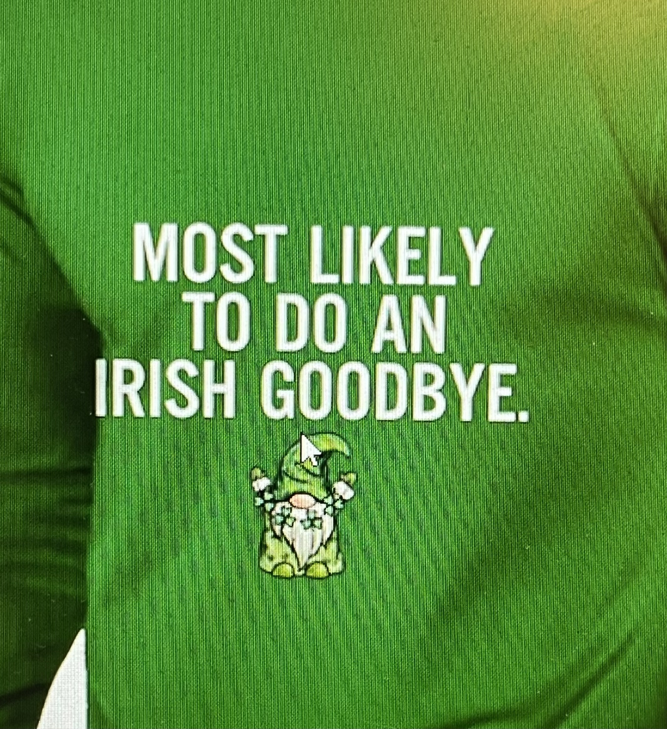 Well, I’m an Irish girl,so yes,I have heard of an Irish goodbye. Sounds like a fun shirt to wear!