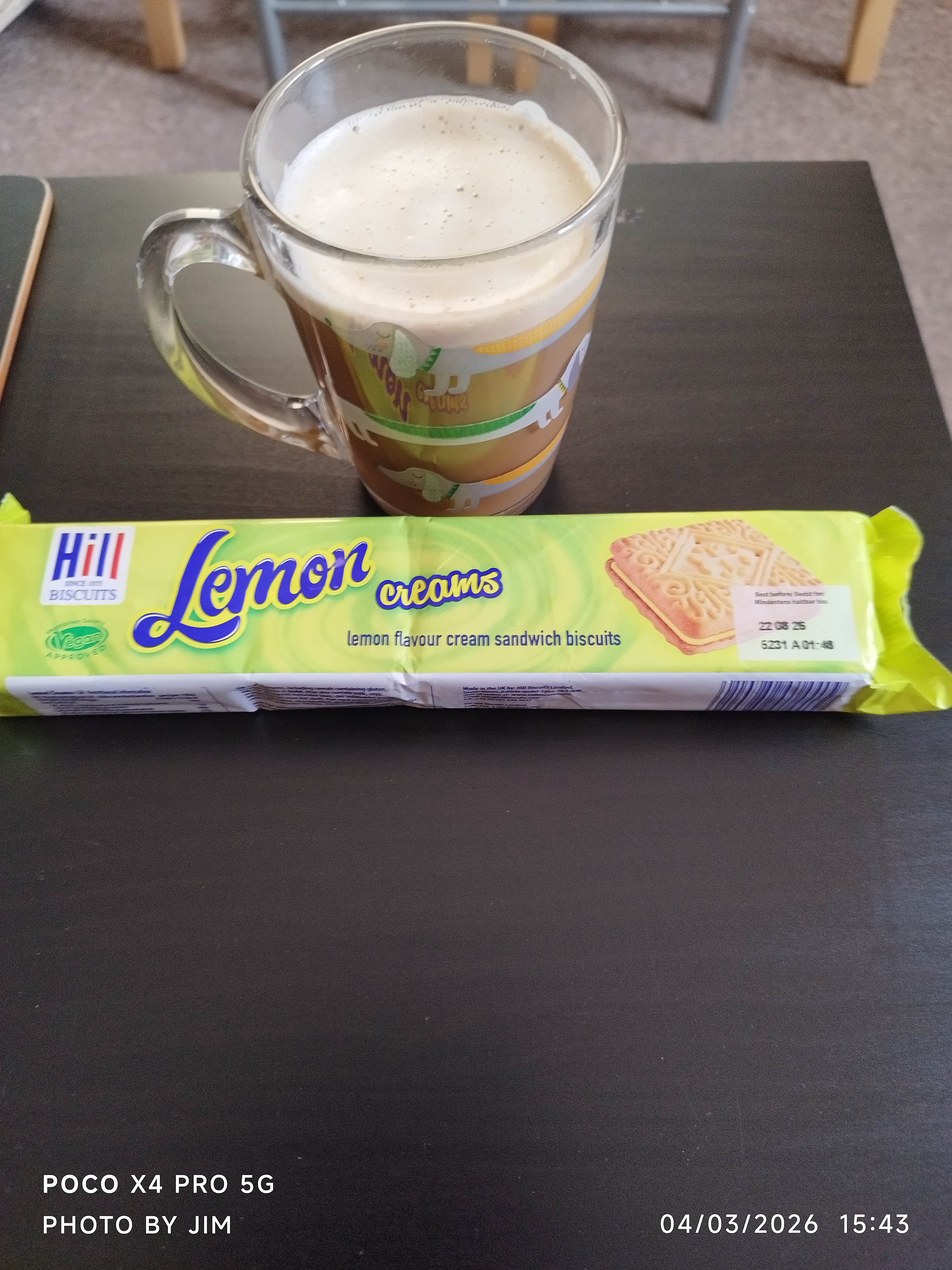 Here we are, means Yvonne , having a coffee and a lemon cream biscuit