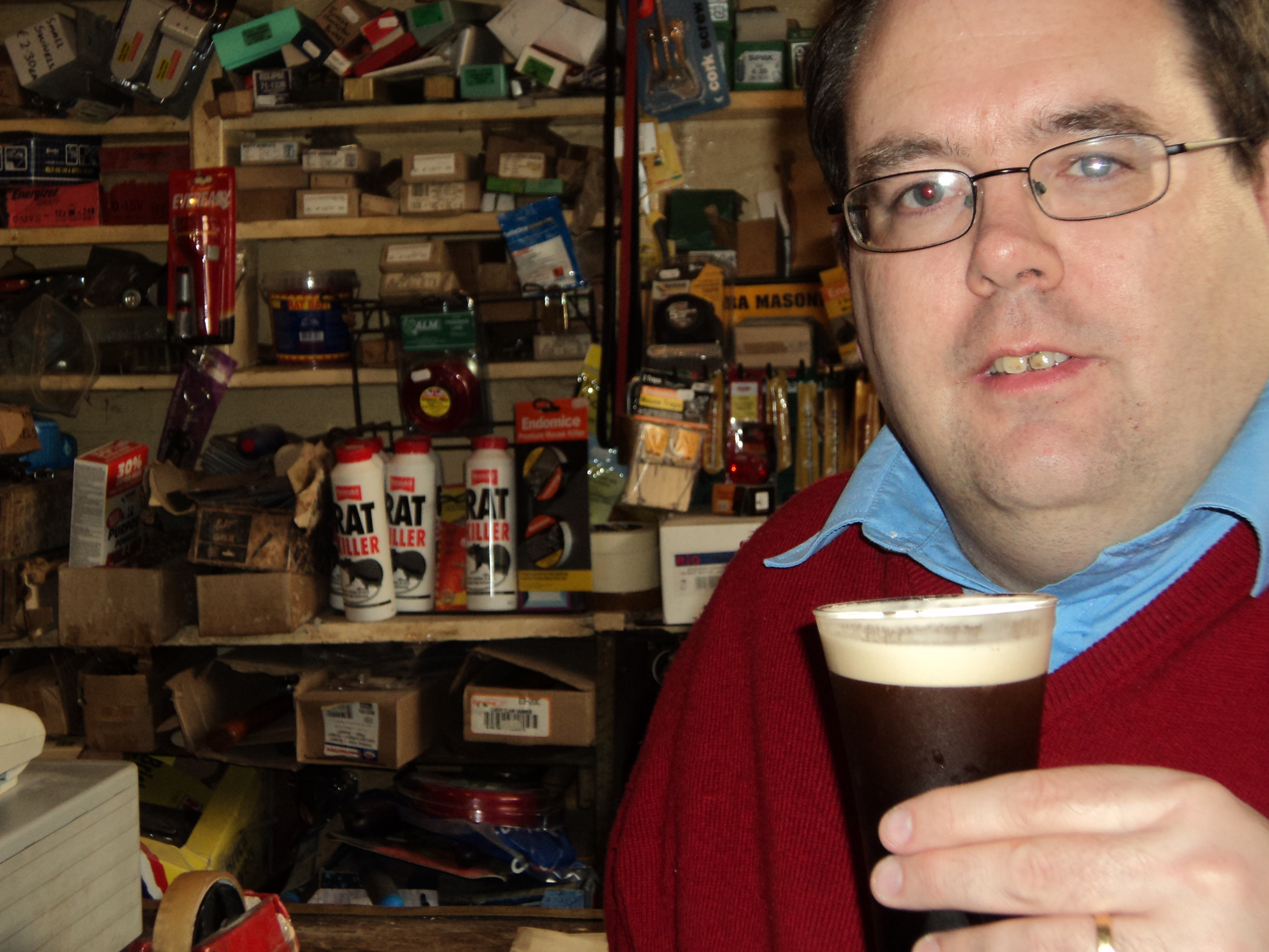 The photo shows a friend drinking in an Irish hardware store with boxes of rat poison in the background. Being able to buy alcohol in retail stores was totally foreign to us. Our liquor laws are quite draconian.