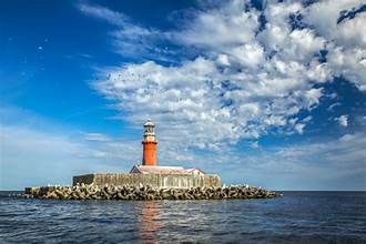 Kolka Lighthouse is a historic lighthouse known as Kolkas baka, located off the coast of Latvia. The lighthouse is located in the Kurzeme region of Latvia. It stands on an artificial island and was first lit in 1884 to guide vessels safely around Cape Kolka, marking the eastern entrance to the Irbe Strait from the Gulf of Riga. It is only accessible by vessel.