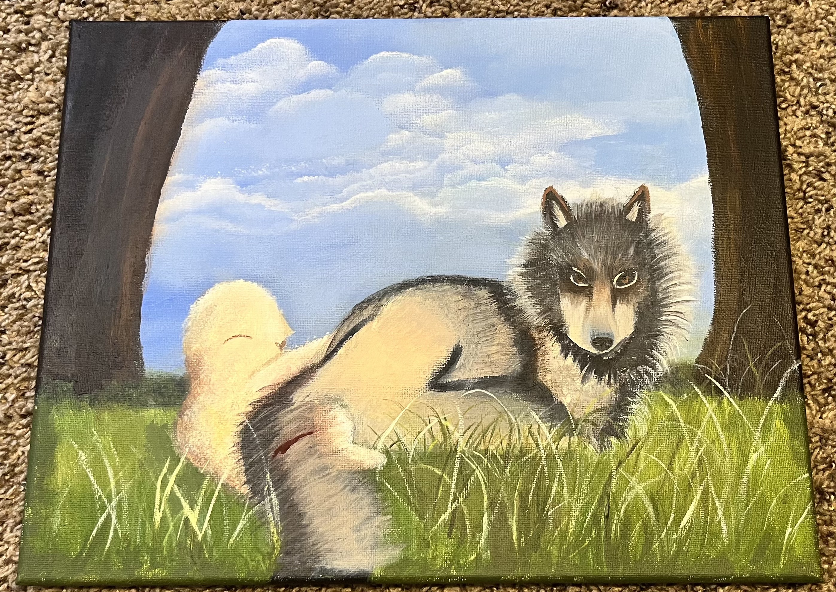 Hey guys. Remember my 14 year old niece, Amyra, who draws? She’s entering another state competition, and this is the piece she is working on. It’s not finished yet. If you can’t tell, it’s a wolf with a sheep behind it.