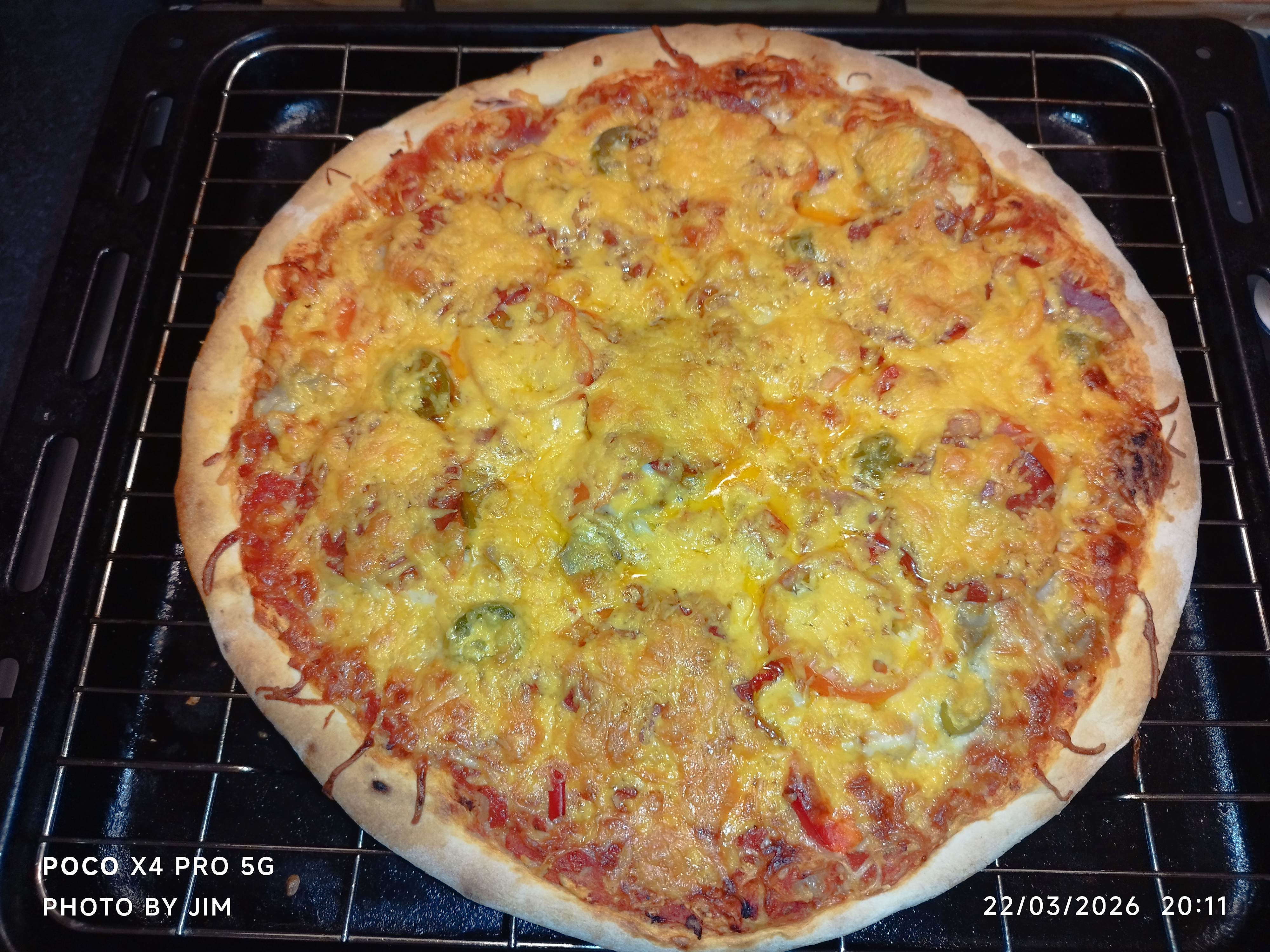 Salami, Pepperoni, Chicken, Red and Green Chillies, Tomatoes, Cheddar Cheese, Bacon, Donner Meat, and the usual white tasteless cheese