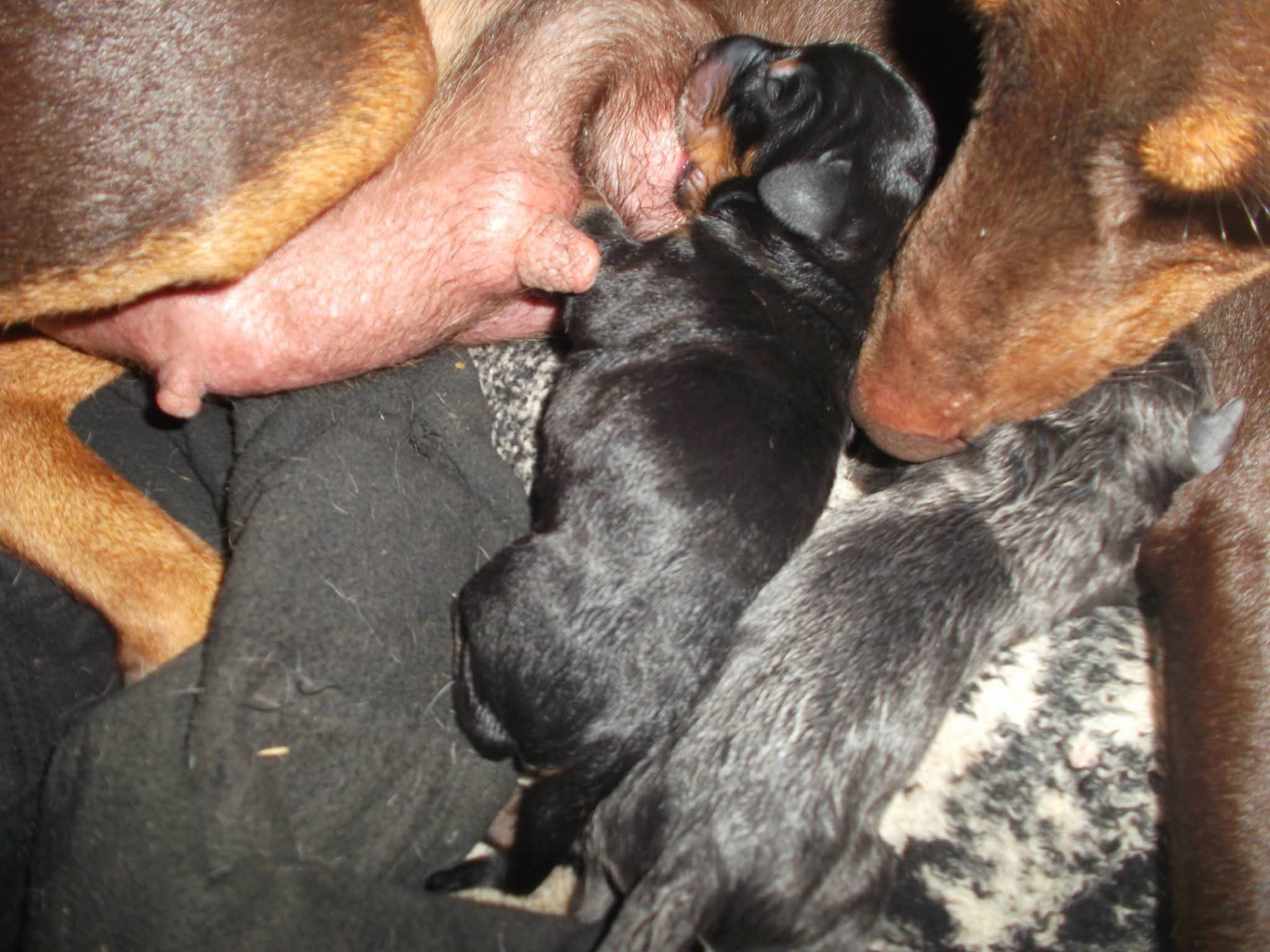 The picture is Jill doberman when she was only about an hour old. She is on the right. That's her brother on the left. He had a home before he was born. Sadly the guy passed away about a year later but the family kept Jack.