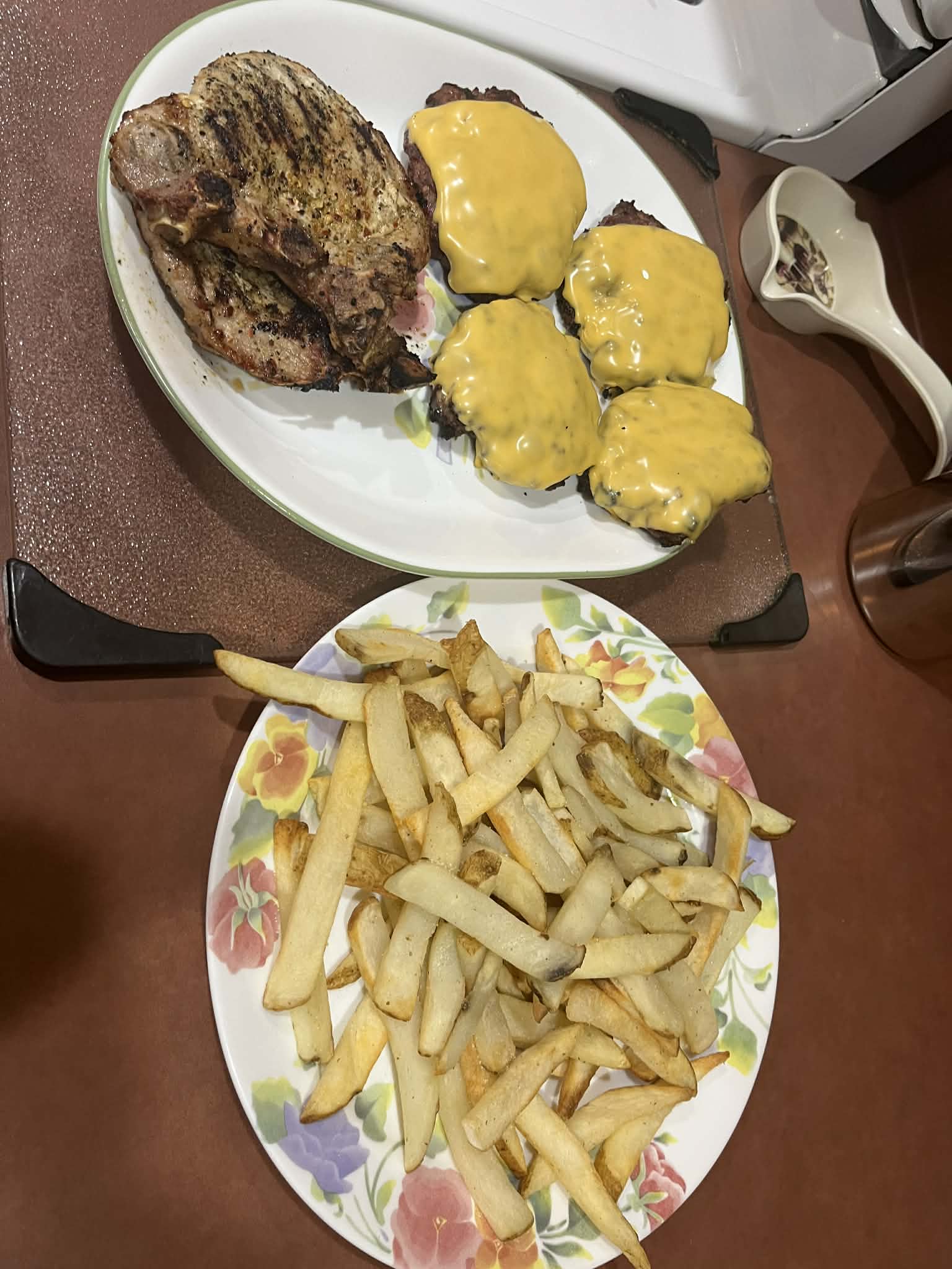 So we grilled the burgers and pork chops. Everyone else had burgers and fries and I am eating fries with shaved parmesean cheese and a pork chop with keylime bbq sauce.