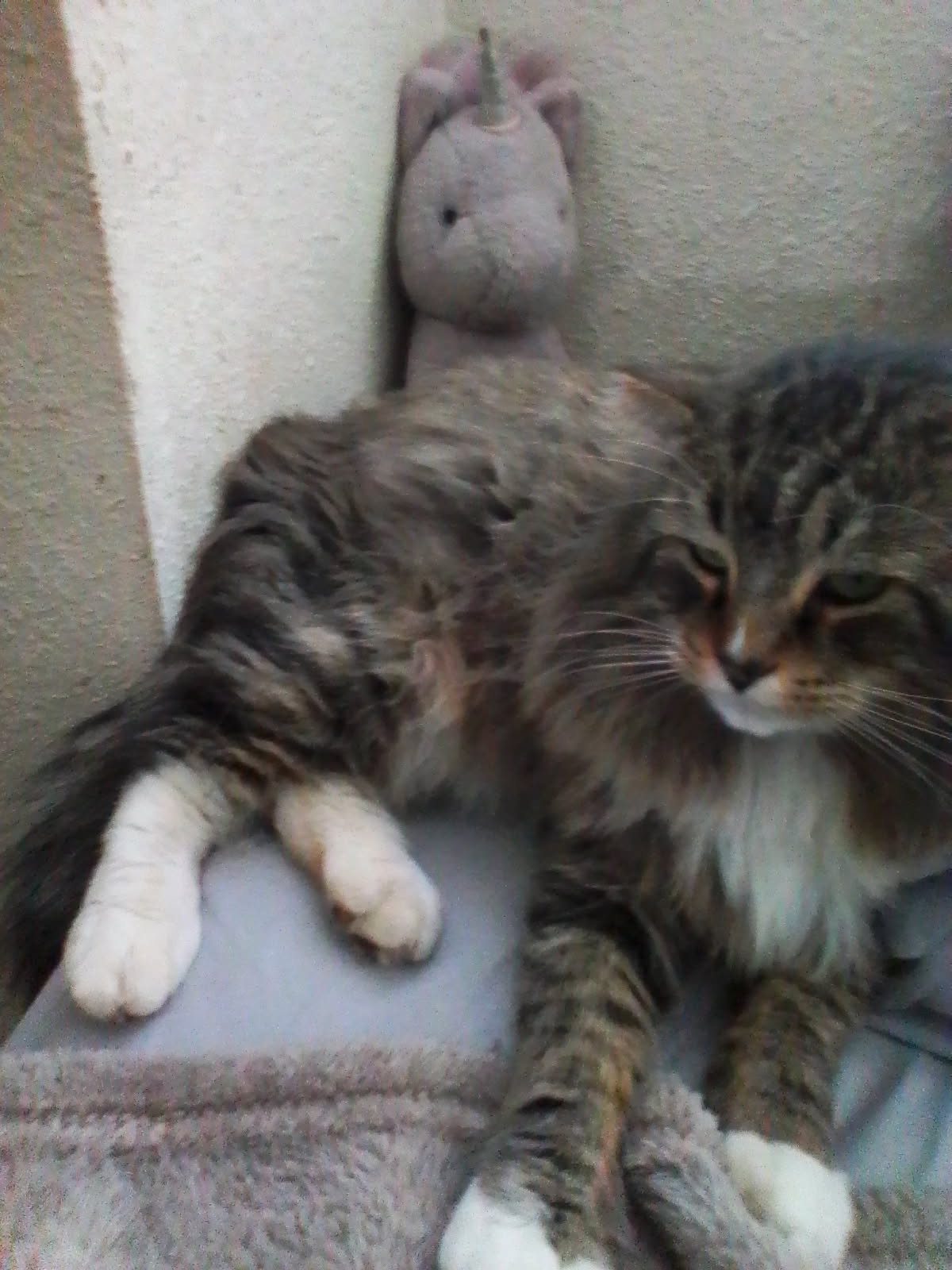 We have four cats. Colbert is one of the two young males. He has true Maine Coone features and is a big boy probably six or seven pounds. He was outside earlier and we are not sure if he killed the little squirrel or if it died falling out of a tree. None the less he brought it home. My grandson took it to another tree a ways away and left it for the squirrels to hopefully do something with. If not he'll deal with it another day. Such a sad occurrence.