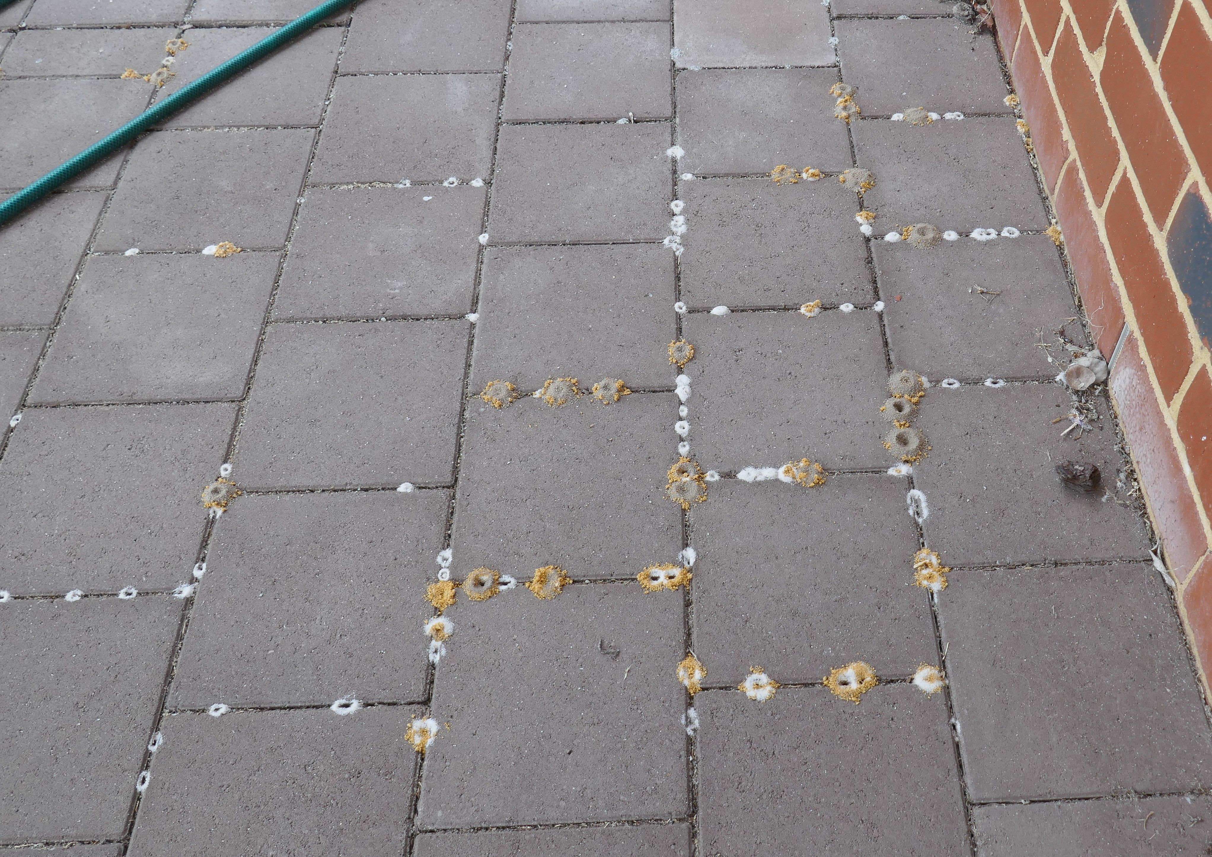 When I went outside next morning, I found this pretty pattern on the patio pavers. It looked like flower petals at first, but the white and yellow heaps are tiny piles of sand. I guess the foundation underneath consists of both white and yellow sand. There is no sign of any ants so I don’t really know what has caused these. They are only on the pavers that are under the roof or under the eaves. I guess I’ll need to go out soon and sweep away the pretty patterns.