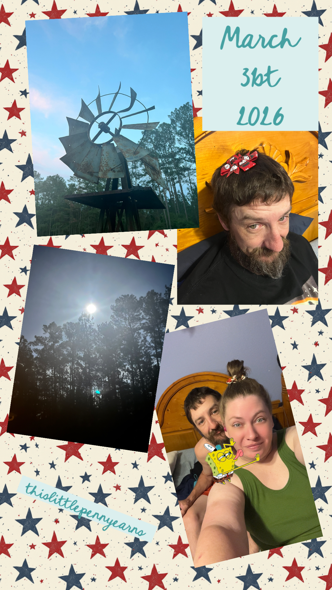 It's just after eleven pm on the last day on March. Today started bright and early for me at about four thirty. Well yesterday never really ended, I only had about two hours of sleep. We hit the road at 720 to take she child to school. After that we hit up Walmart and then went and checked on a friend. His wife died earlier this month and I've tried to make sure that he knows were here for him.