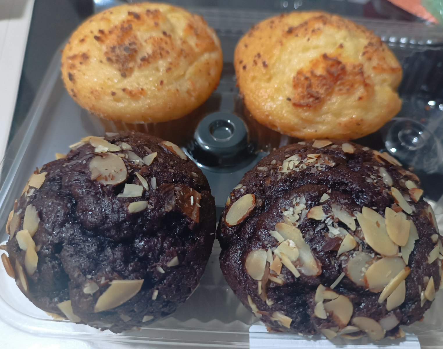 There are only two flavors, cheese and chocolate with almonds. Me and daughter ate three muffins (one and a half each). Daughter will bring 3 to her dorm for her snacks. I will give two to my nephew's son whom we took care of when he was a baby.