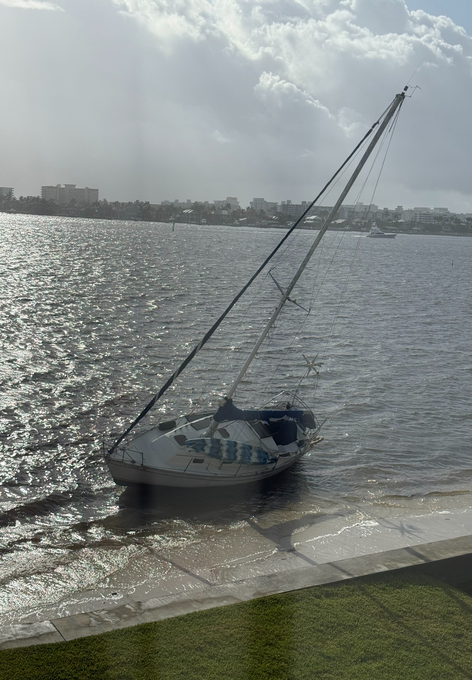 Hubs and I were watching yesterday’s deluge when we saw a sailboat adrift. It ended up in our backyard, so so speak, while another boat got separated from its dock and floated by.