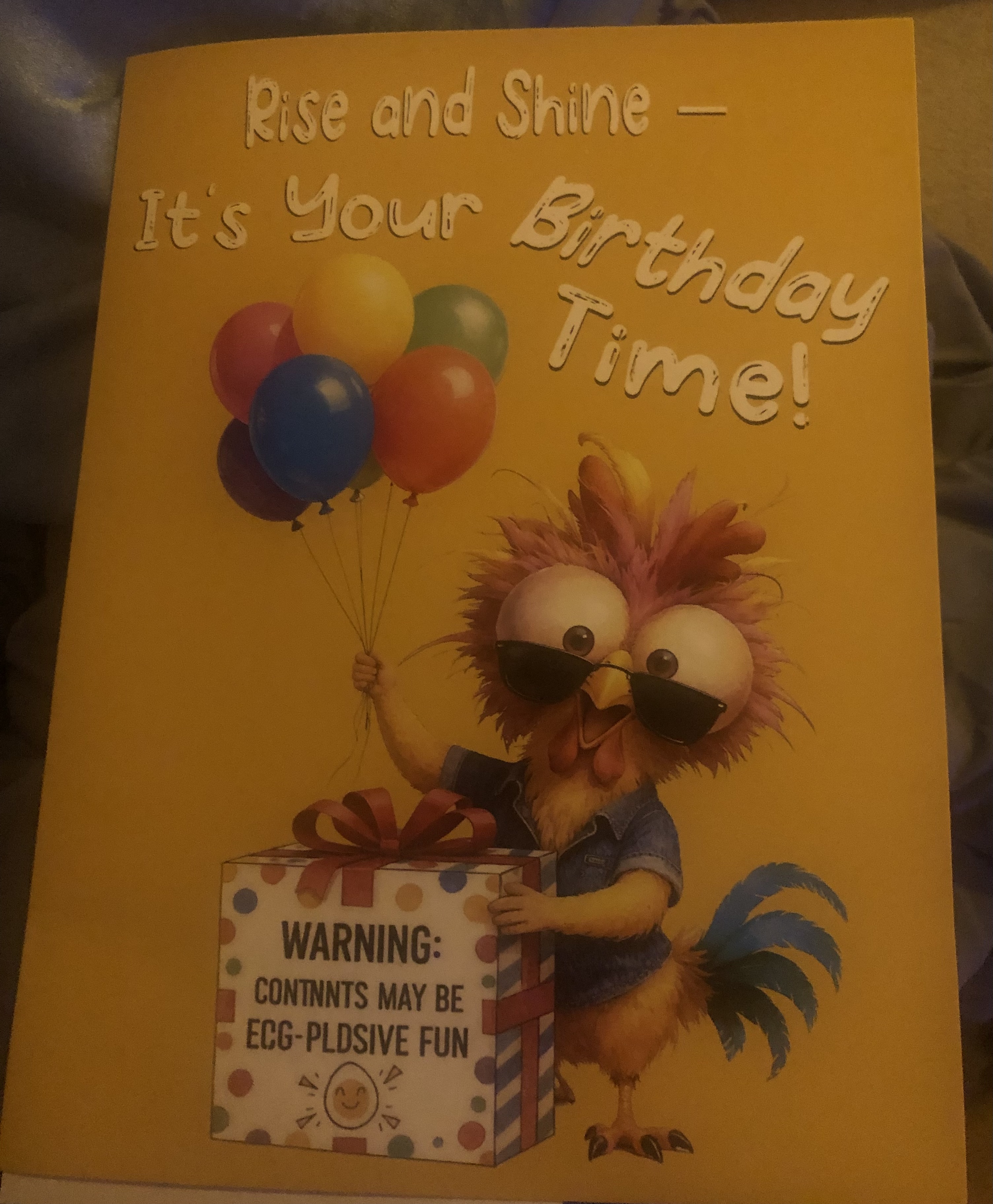 So pictured is a greeting card I was sent to review. As you can see there are noticeable misspellings near the bottom. It opens to a dancing chicken squawking and singing happy birthday. So it’s a cute card. To me, since I knew it was from China, I could tell right away it was misspelled. However, I was hoping someone would assume it was misspelled because it’s a chicken, and chickens can’t spell (this being the joke). Well, everyone I showed, said you can’t pass it off as normal; it’s an error they’d know was an accident. My dad’s wife though, liked the card so much, she asked if she could give it to her daughter. I said sure. Her daughter thought it was hilarious (the inside really is).