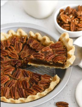 My favorite dessert is pecan pie. Pecans are a seasonal nut grown on trees here in the US. The pie is made by baking syrup and other ingredients and the pecans rise up through the syrup mixture to float on the surface. It's almost pure sugar. A pecan pie is about 10 inches/254 mm across. You can get 8 slices or more out of one pecan pie.