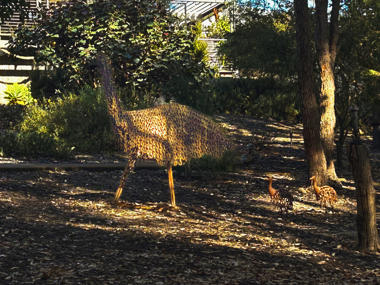 We took Jensen for another walk this morning. At the edge of the creek beyond the bottom of the garden, we turned right instead of left and within a few backyards, we came across this emu and two chicks. The adult is made from chain and I think the chicks are made from tin.