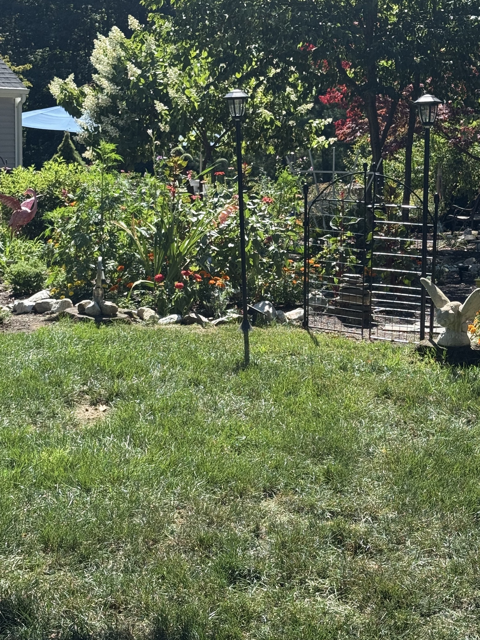 So, I do what I can. I always wanted a garden gate, so about 2 years ago, hubs helped me put this one in. I enhanced it with 2 lampposts with solar lighting. It does look pretty at night. I usually just walk into my flower garden from wherever I am in the yard. No gate needed.