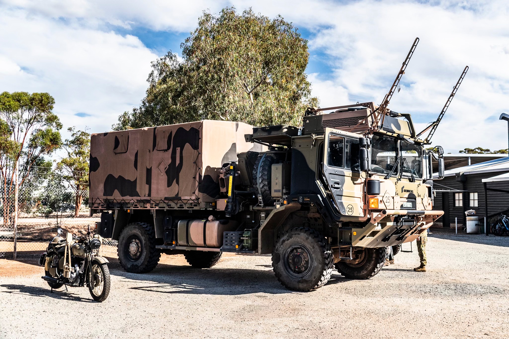 It shows a military truck that was on display at the Nungarin Military Museum. I wondered what the two long antenna-type rods were. It seems they are high-level wire-cutters. A gunner would be firing from above the cabin. The enemy would string wires high up in the hope of taking out the gunner.
