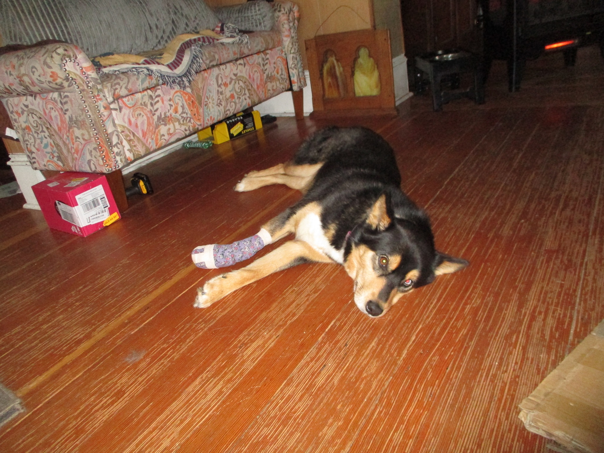 The photo should show Moxe lying on my living room floor. We are back from the Vet clinic. She tore her entire nail off. The Vet put a good sized bandage on her foot and leg. And she administered anti-inflammatories and anti-biotics. The bandage must stay on for a week- and get this- stay dry. My corner is in the middle of rain storms. Interesting days ahead for us.