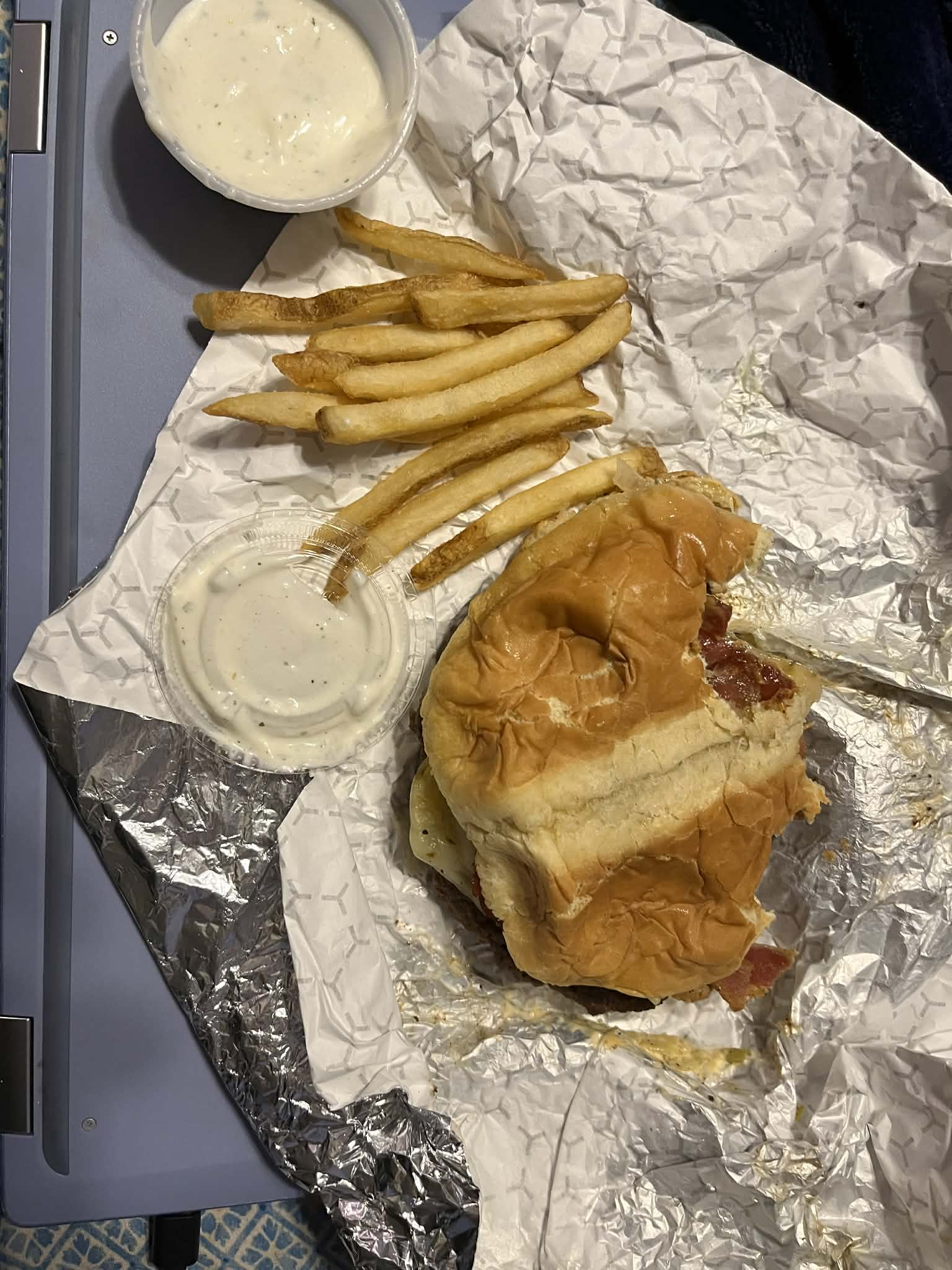 So we got food to go. The main thing is the pub burger, which is a 1/3 pound hand pattied burger. Chris and his mom got bacon pub burgers and fries. I got the southwestern pub burger and fries. Which meant my burger was a bacon pub burger with a southwestern sauce and jalapenos. She child got a cheesburger and fries and he child got chicken fingers.