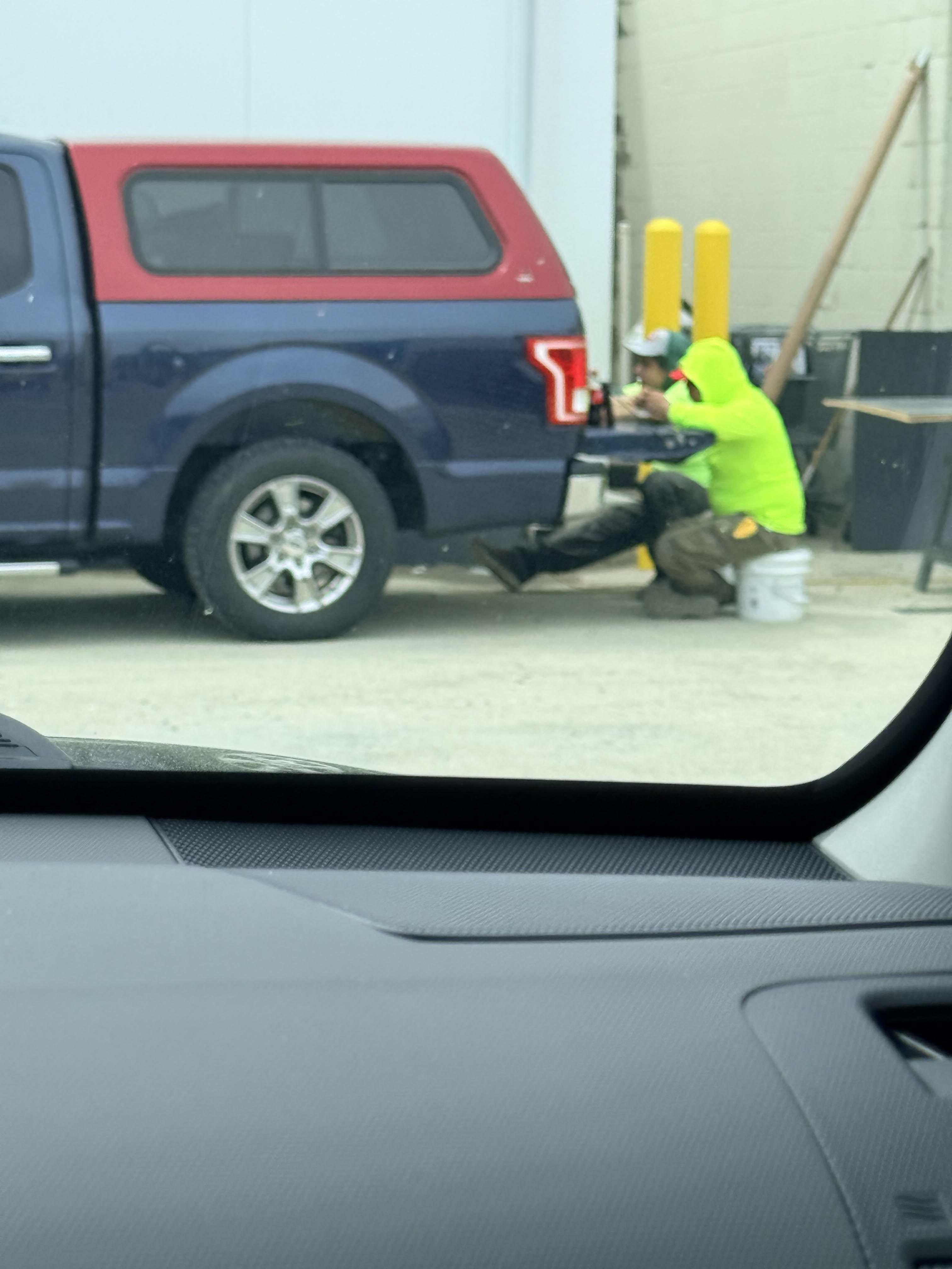 The two workers are sitting on what looks like paint buckets as chairs having lunch on the lowered tailgate of their pick-up truck. What you can't see in the photo and it didn't happen until later was that they had a tiny microwave plugged into the back of the truck and they were heating up their food. It looked like soup or stew.