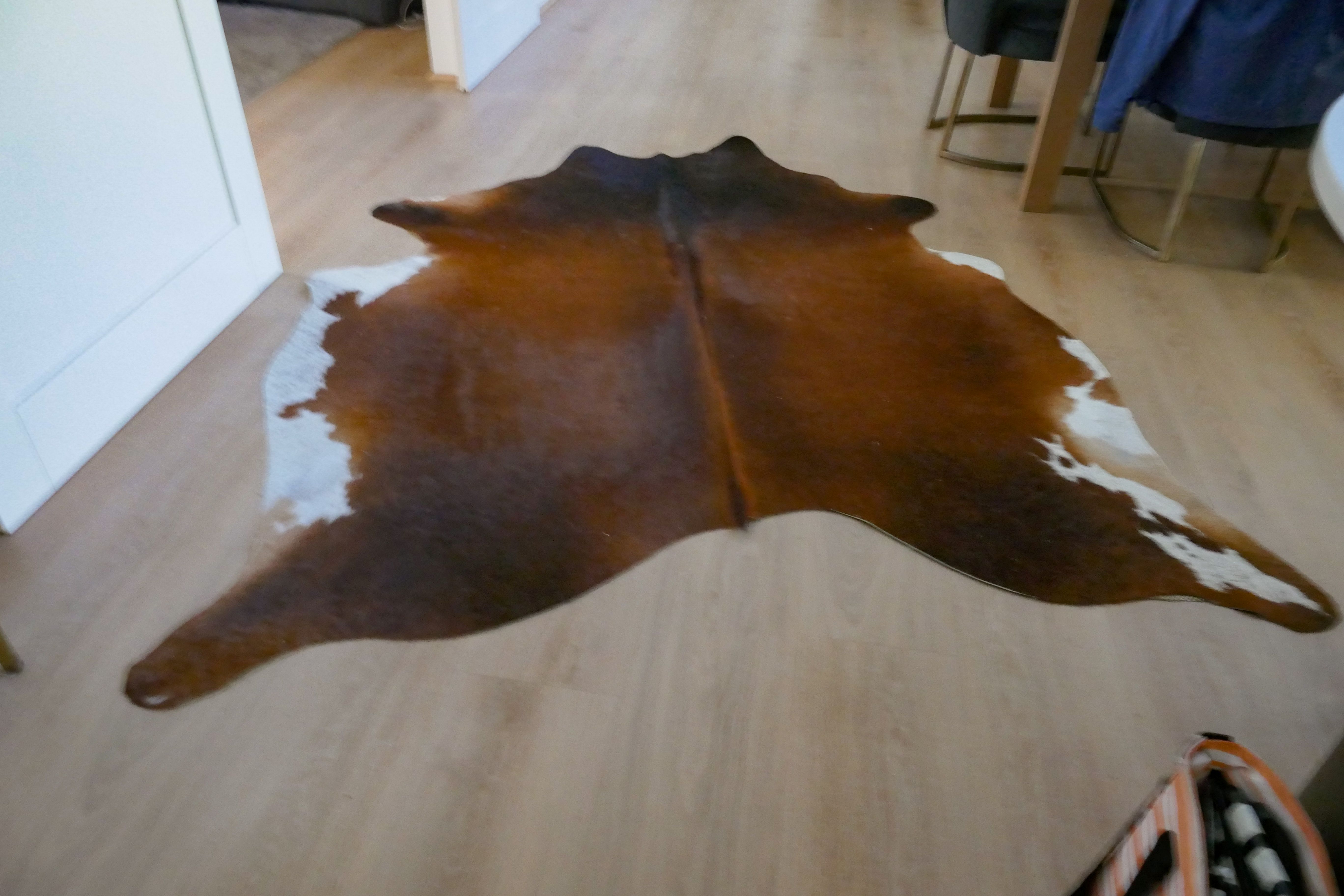 An interesting thing about house-sitting is seeing how others decorate their homes. The house we’ve just left has this cow-hide rug on the floor. They don’t really appeal to me.
