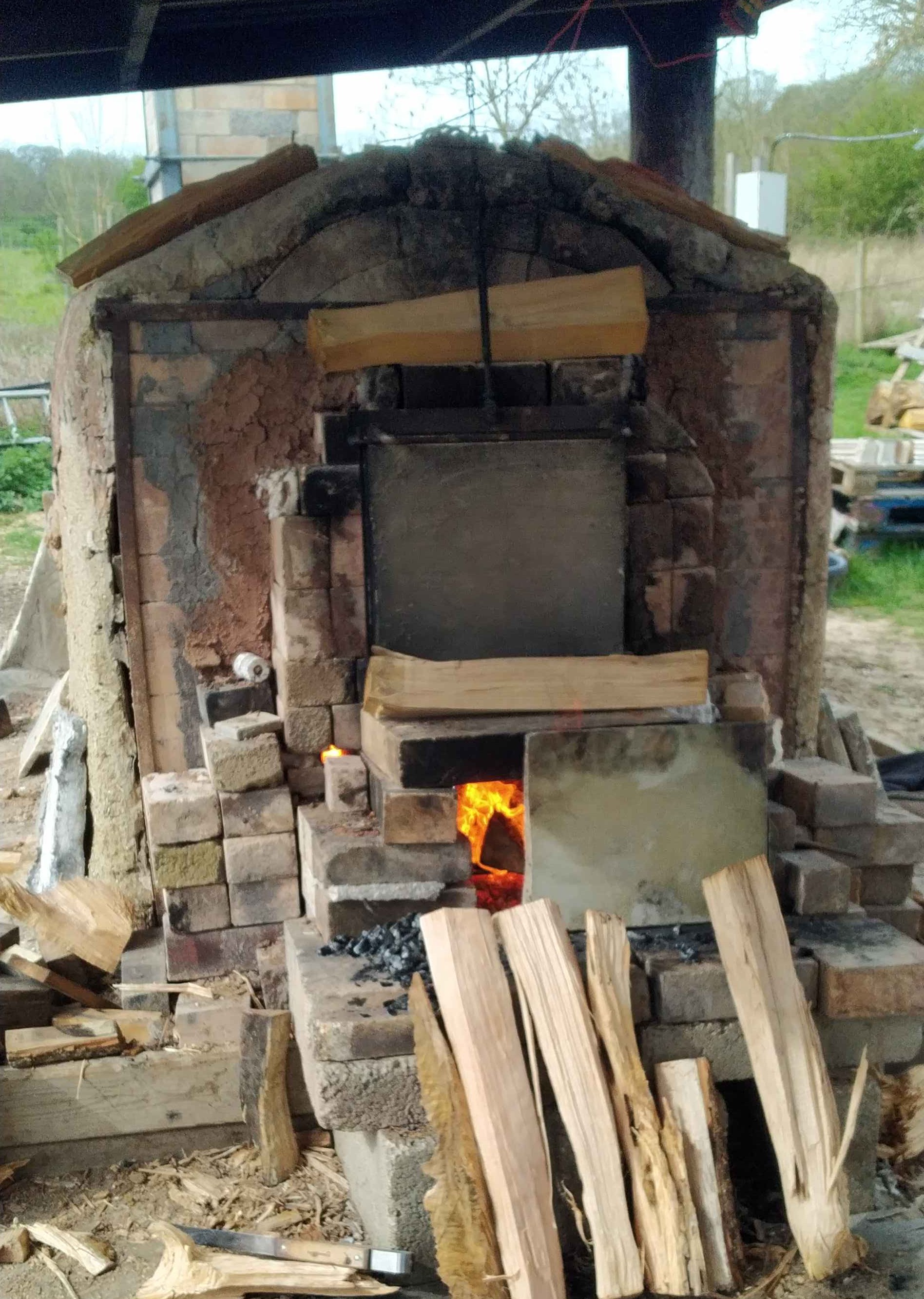 When I arrived there were about six people working, two of them splitting logs to provide the seemingly endless stream of wood required, and two teams of two taking turns in shifts to tend the fire, wearing goggles and long leather gloves, constantly checking the temperature, feeding in more wood (either through the bottom door or a second one above it) every couple of minutes, and making sure it is burning cleanly and not getting clogged up with ash. This went on day and night – three people had brought tents to sleep between their shifts, while another slept in his car – he only woke up when someone tapped on the window thinking he might be dead