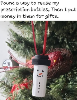 Here is one of the things that one of the local Girl Scout troups made out of pill bottles--to hang on the tree, and use as a place to gift money. I think they were so cute! They made little Santa ones, too, and ones with little evergreen trees. I am going to make some this year, I think